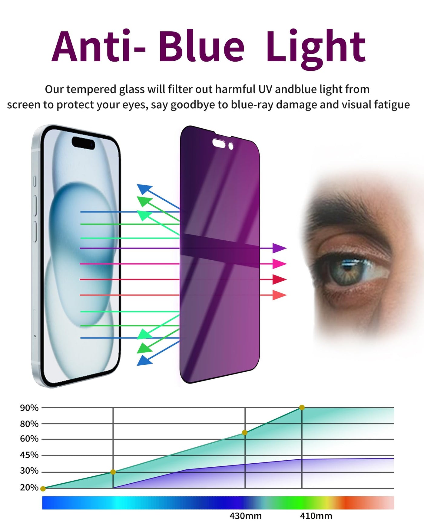 Privacy Screen Protector For Iphone 15 Plus 5G 6.7'' Features: 2 Pack: Includes 2 Privacy Screen Protectors Gradient Light: The Screen Protector Displays A Glitter Purple-Rose Gradient When Viewed From Different Angles Under Light. Anti Bluelight: Utilizes Blue Light Filtering Technology To Remove Blue Light Emitted From Your Phone Screen. It Effectively Filters Out 95% Of Blue Light While Allowing Non-Harmful Light Through, Helping Prevent Sleep Disorders And Eye Strain. Anti Peep: Protects Your Private And Sensitive Information From Strangers In Public Places Such As Buses, Elevators, And Metros. The Screen Is Only Visible To Individuals Directly In Front Of It. Impact & Scratch Protection: Made With High-Quality Tempered Glass That Has A Hardness Rating Of 9H, Providing Scratch Resistance And Helping To Prevent Your Iphone 15 Plus Screen From Breaking. Shatterproof Design: Designed To Resist Shattering Or Splintering. In The Event Of Screen Damage, The Pieces Will Stick Together For Safety. Sensitive Touch: This Tempered Glass Provides Privacy Protection While Ensuring Quick App Operation And Sensitive Gameplay. Full Coverage & Case Friendly: The Screen Protector Covers Almost The Entire Screen Of The Iphone 15Plus, Leaving A Slight Space On The Edges For Easy Phone Case Entry Without Lifting Up The Protector. Package Accessories: 2 X Iphone 15 Plus Screen Protector 2 X Wet And Dry Wipes 2 X Dust Removal Stickers 1 X Installation Framework