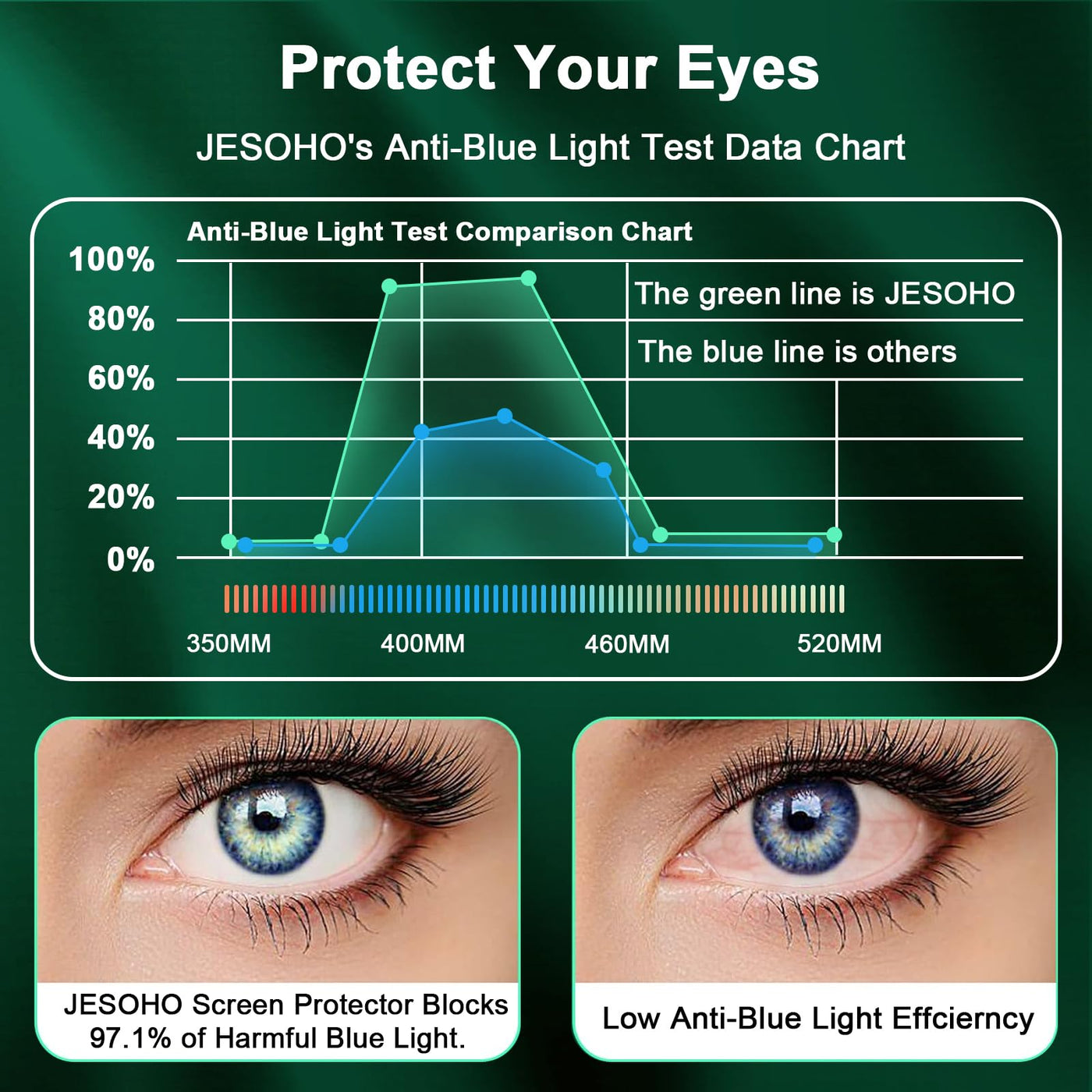 Q: How effective is the blue light blocking feature of this screen protector?A: The JESOHO screen protector blocks 97.1% of harmful blue light with wavelengths between 380nm-450nm, effectively reducing eye fatigue and providing eye protection during screen usage.
