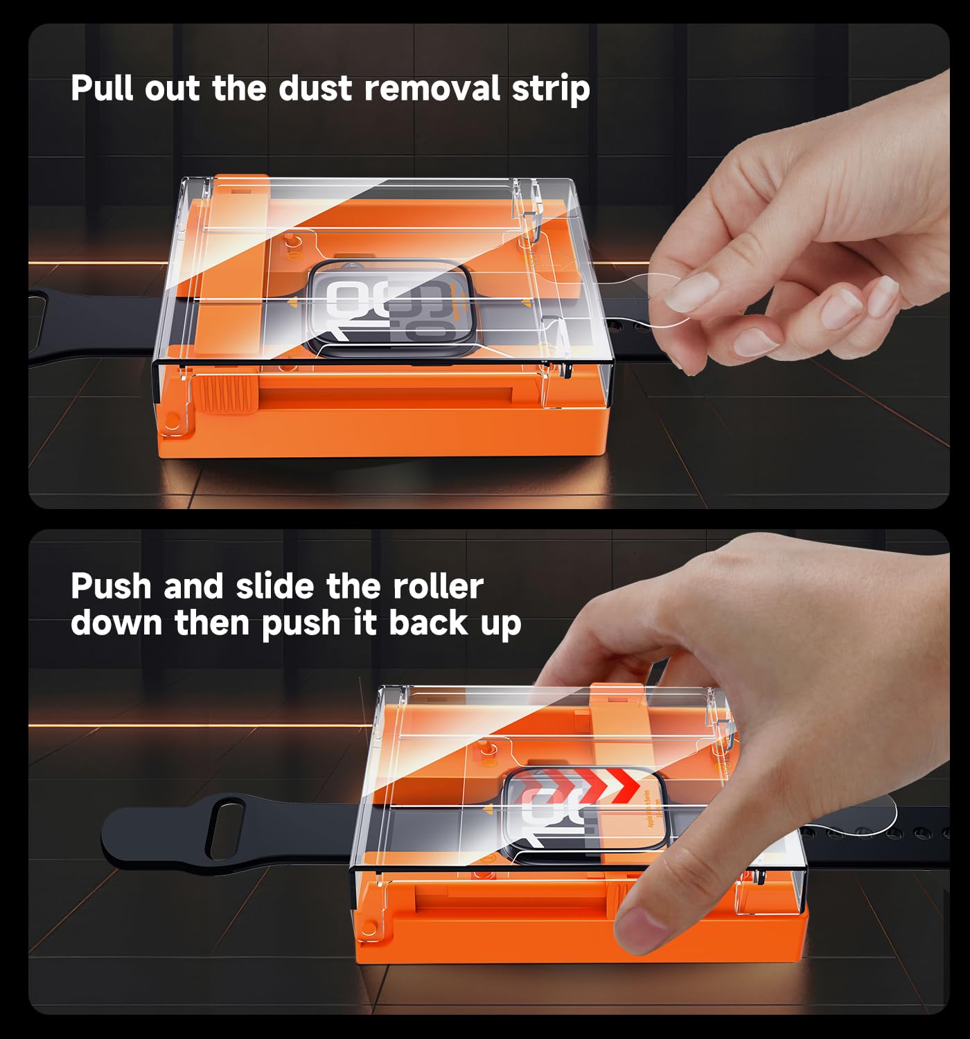 Q: How does the Automatic Align Tech work for installation?A: The Automatic Align Tech allows for easy installation without removing the watch strap. Simply cover the screen protector and pull it down; it automatically aligns itself and releases air bubbles quickly, making installation straightforward.