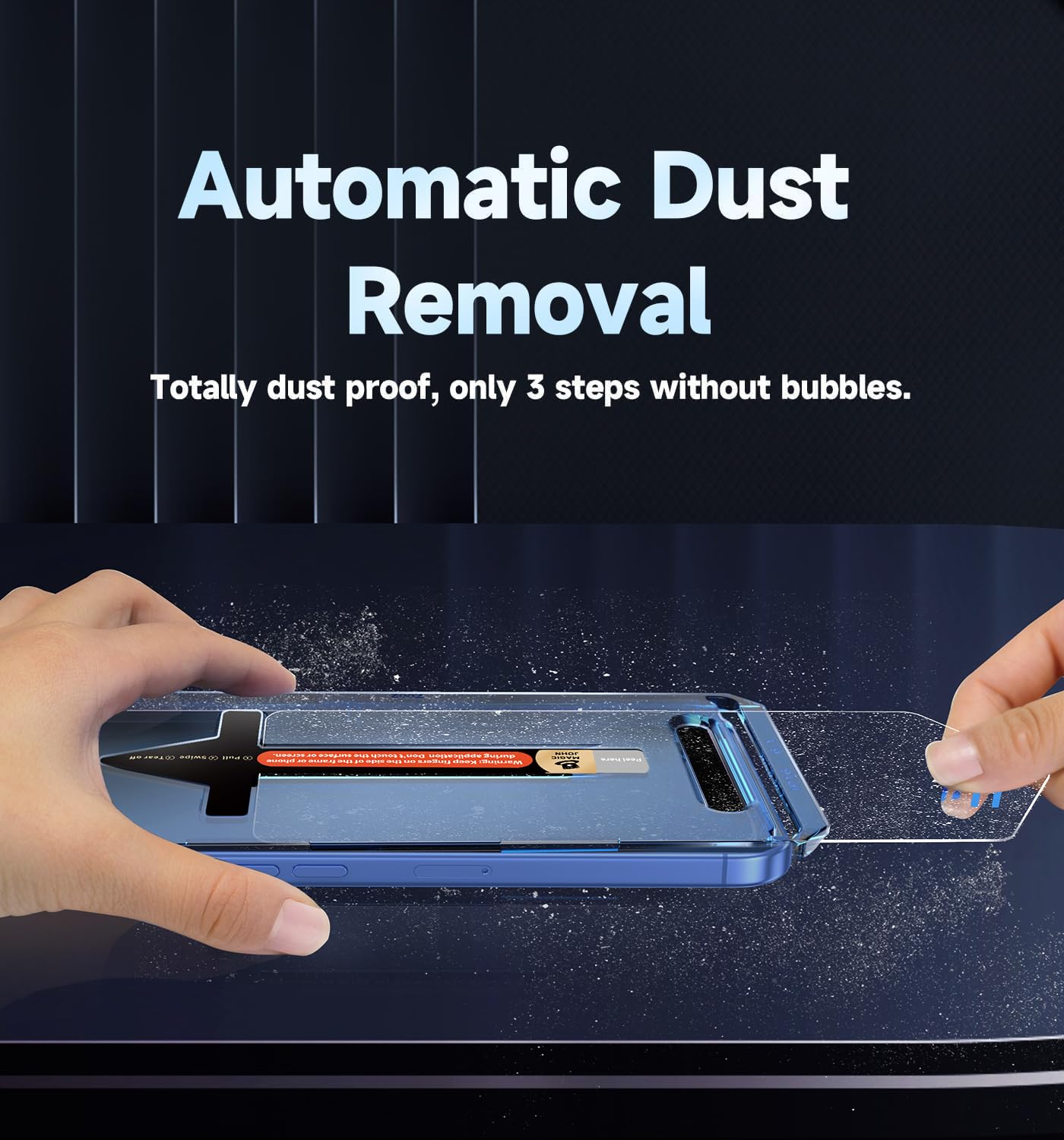 Q: How does the automatic dust elimination feature work during installation?A: The automatic dust elimination feature allows the screen protector to align itself perfectly when you cover and pull it down. This technology helps to remove any dust particles, resulting in a bubble-free installation.