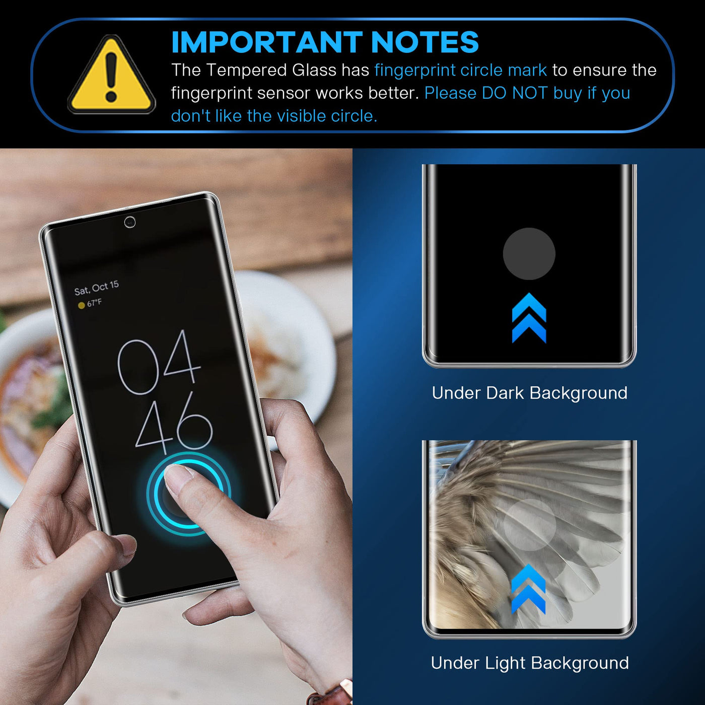 Q: How does the fingerprint unlock feature work with this screen protector?A: The screen protector includes a visible circle mark with special glue on the fingerprint area, allowing the fingerprint recognition feature to work effectively. This design ensures high clarity and maintains touch sensitivity.