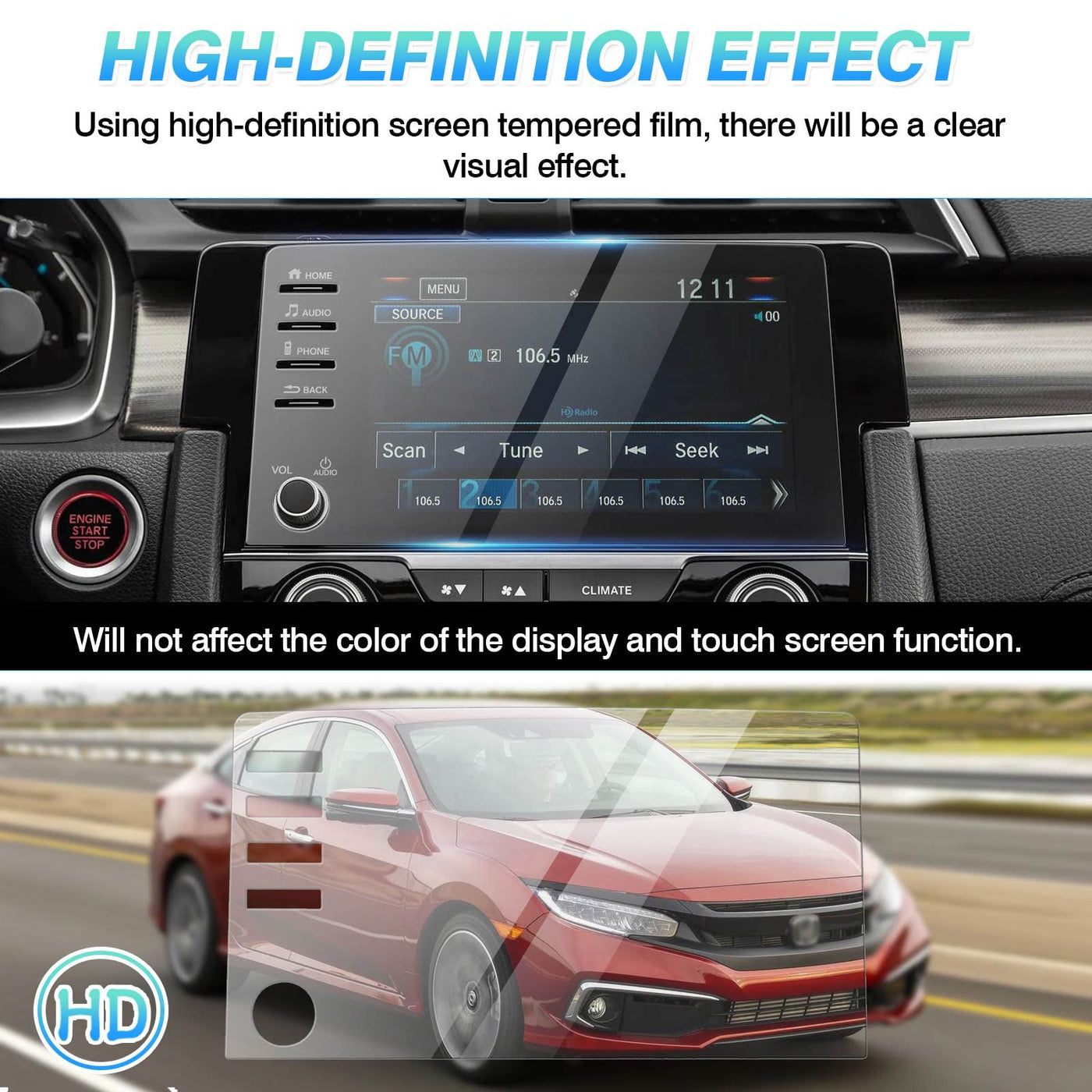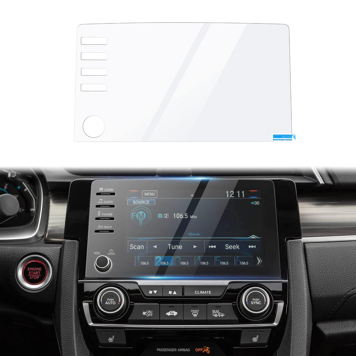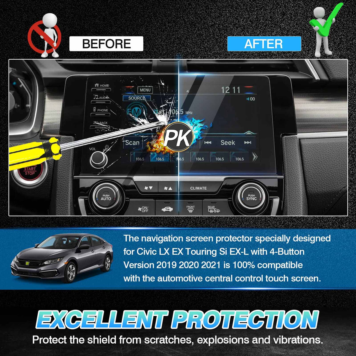 Perfect Compatible---This Navigation Screen Protector Specially Designed For Honda Civic Lx Ex Touring Si Ex-L 2019-2021 Is 100% Compatible With The 4 Buttons Automotive Central Control Touch Screen. | High-Definition Effect---Using High-Definition Screen Tempered Film,There Will Be A Clear Visual Effect. Will Not Affect The Color Of The Display And Touch Screen Function. | Excellent Protection---Protect The Touchscreen From Scratches, Explosions And Vibrations.The Surface Hardness Up To 9H, Stronger Scratch Resistance.Good Adsorption, Not Easy To Fall. | Sensitive Touch---It Can Effectively Block Grease And Water, And Has A Smooth Touch.And Will Not Leave Any Residues On The Navigation Screen After Removing. A Must-Have Accessories For Civic. | Easy To Install---Align The Position,The Tempered Glass Screen Protector Will Be Automatically Adsorbed, And The Installation Can Be Successful With The Touch Of Your Finger.