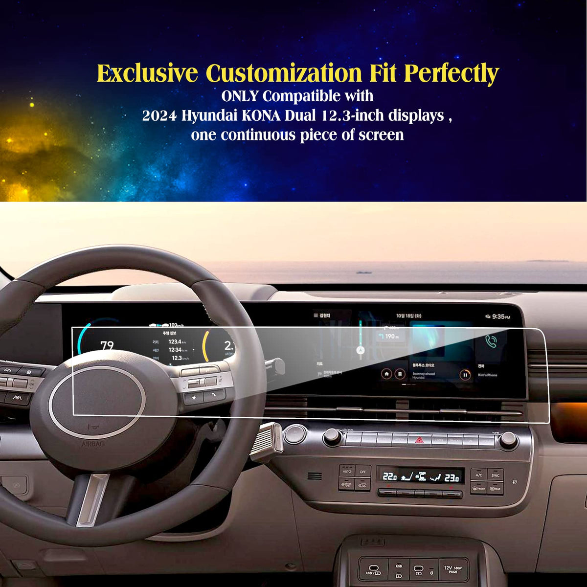 Eueky Screen Protector Compatible With 2024 Hyundai Kona Dual 12.3-Inch Displays ,One Continuous Piece Of Screen Why Do You Choose Eueky Hyundai Kona Screen Protector,2024 Hyundai Kona Screen Protector,Kona Screen Protector,Hyundai Kona Accessories,Hyundai Kona? 1.Reinstallable: Excellent Adhesion Makes For A Bubble-Free Installation. Spots, Bubbles Or Non-Adhesive Parts During Installation Are Usually Due To The Screen Dust Not Being Wiped Clean. In This Case, You Should Carefully Lift One Corner Slowly First, Do Not Force It To Prevent It From Breaking, Drag The Lower Left And Right Corners With Both Hands To Slowly Lift It Up To The Dust Position And Wipe It Clean, Then Reposition It, Then It Will Automatically Stick To The Screen Again. 2.Kona Accessories,Kona Screen Protector 2024,Hyundai Kona Screen Protector 2024,Hyundai Kona Sun Screen,Car Screen Protector Hyundai Kona 2.5D Curvature, Upgraded Explosion-Proof, Perfect Fit, 0.33Mm Thickness, Clearer Original Colour Display, Immediate Response, More Sensitive And Smooth Touch. 3.Hyundai Kona Screen Protector,2024 Hyundai Kona Screen Protector,Kona Screen Protector,Hyundai Kona Accessories,Hyundai Kona About The Package: 2 Soft Screen Protector, Dry/Wet Wipe, Auxiliary Sticker, Dust Removal Sticker. To Ensure Your Shopping Experience, Please Make Sure That Your Model Matches Before Purchase. Note: 1. Before You Order, Please Make Sure That Your Touch Screen Size Is Compatible With The Protector. 2. Please Ensure That Your Screen Is Original And Not Assembled. Installation Tips 1. Wash Your Hands Thoroughly And Keep Them Clean And Dry. 2. Clean Your Screen With A Damp Rag. 3. Dry The Screen Without Leaving Any Residue. 4. Remove Any Dust From The Screen With The Sticker Provided, Align The Protective Film With The Screen And Remove The Film From Its Back. Peel Off The Protective Film And Place The Sticky Side On The Screen.
