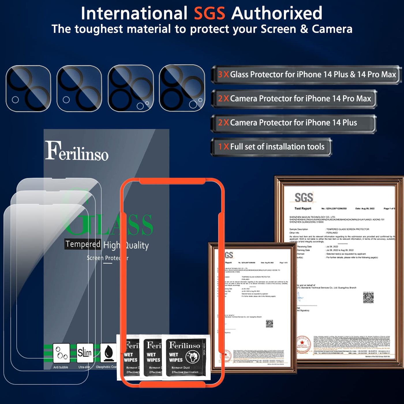 Q: What is included in the Ferilinso screen protector bundle?A: The Ferilinso 6-in-1 bundle includes three glass screen protectors, two camera lens protectors for the iPhone 14 Plus, two for the iPhone 14 Pro Max, and a full set of installation tools including a mounting frame and cleaning kit.