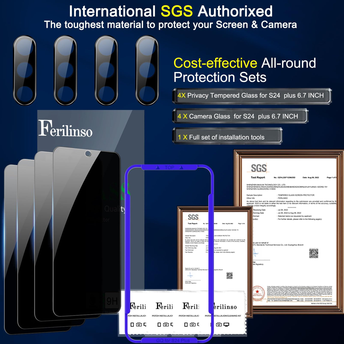 Q: What is included in the Ferilinso Privacy Screen Protector bundle?A: The Ferilinso bundle includes a 4 pack of glass screen protectors and a 4 pack of camera protectors specifically designed for the Samsung Galaxy S24 Plus. Additionally, the package comes with a mounting frame and a cleaning kit to assist with installation.