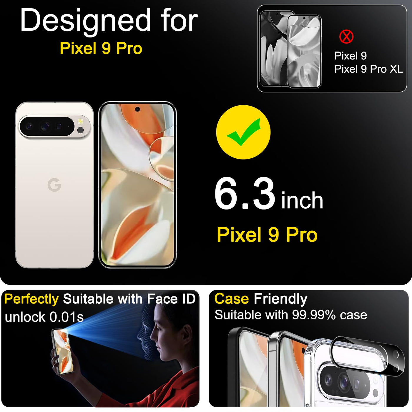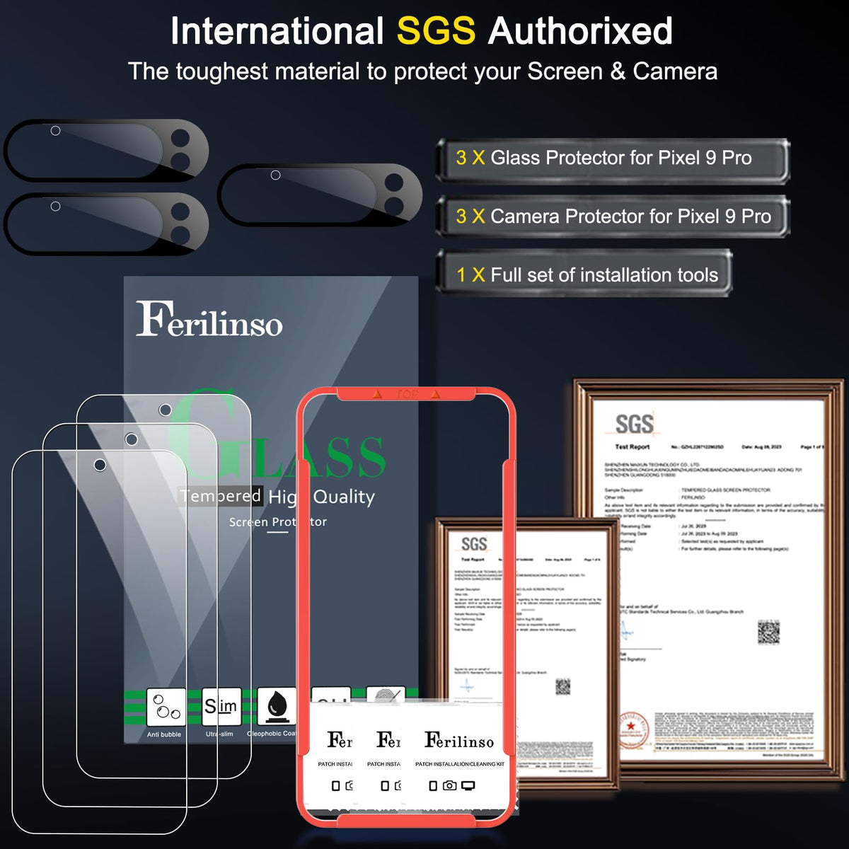 Please Note: After Installing The Protector, You Need To Re-Record Fingerprints[Very Important][Very Important]. In This Way, You Will Get A Perfect Fingerprint Unlock And Super Fast. The Ferilinso Bundle Includes: [3 Pack 9H+ Tempered Glass & 3 Pack Camera Protector] [Includes Mounting Frame And Cleaning Kit] [So Easy Installation]. Plus, Whatever Problems, You Can Send Us Information Through Amazon'S Message Center, We Will Provide You With Satisfactory Service Within 24H. | Invisible Protection, Full Covers The Phone'S Screen: Simulating Phone'S Screen Design, Ferilinso Envelops The Screen'S Every Curve With A Reinforced 1:1 3D Curved Black Edge, Getting The Most Vulnerable Screen Edge Fully Covered. Also, It Is Visually Invisible As It Blends Seamlessly With The Screen! Leaving No Corners Uncovered And Preventing Dust And Scratches From Invading, While Also Being Suitable With 99.99% Cases. | Unbreakable 9H+ Glass, 2Nd Screen Of Your Phone: Unmatched Shatterproofness And Durability, It'S Designed Specifically For The Google Pixel 9 Pro Screen. 9H+ Tempered Glass Material Is The Core, Which Is Widely Used In Aerospace And Military For Its ?Shatterproof ?Scratch & Wear Resistant ?Durability Is 8-10 Times Superior To Others. Thus, 9H+ Glass Creates A 2Nd Tough Screen For Your Google Pixel 9 Pro. | Ultra Hd Bare Screen Experience, Fingerprint, Smudge Free: Adopting Exclusive Coating Technology Providing Maximum 99.99% Optical Clarity For Best Visual Feast Brought By The Phone Screen(Face Id Support: Premium, High-Transparency Glass Means You'Ll Be Able To Use Face Id Just Like Normal). Plus, Thanks To The Special Ferilinso-Silk Technology To Prevent Smudges And Fingerprints Oil, Reducing Up To 98% Of Marks On Your Screen, Keeping Your Google Pixel 9 Pro Screen Clean And New. | Powerful Lens Protection: The Lens Of The New Google Pixel 9 Pro Cell Phone Stands Out In Particular, And To Better Protect The Exposed Lens, You Are Provided With 3 Pack High-Quality Lens Protectors. It Is Made Of Sapphire Material And 9H+Glass With Unparalleled Resistance To Daily Wear And Tear And Impact, Providing Military-Grade Protection. The High Light Transmittance Sapphire Material Ensures That Your Photography Maintains Its True Essence, Vibrant Colors And Crisp Details. | Compatibility: Only Fits For Google Pixel 9 Pro, 6.3 Inch. Please Make Sure Your Phone Is Google Pixel 9 Pro, Not Other Phone Models.
