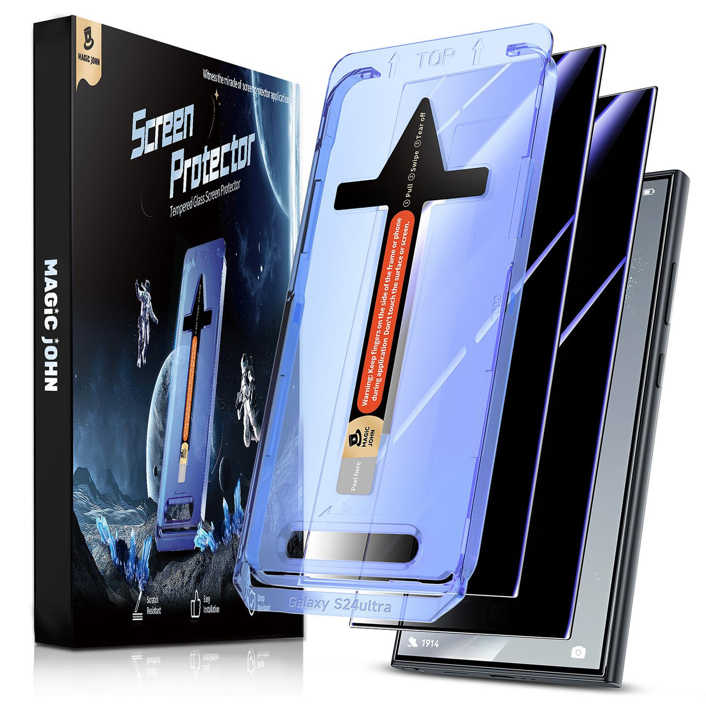 Q: What level of protection does the 9H hardness provide for my Galaxy S24 Ultra?A: The 9H hardness of the MAGIC JOHN screen protector offers excellent protection against daily wear, such as scratches from dust, oil, and fingerprints, and can also help guard against minor drops.