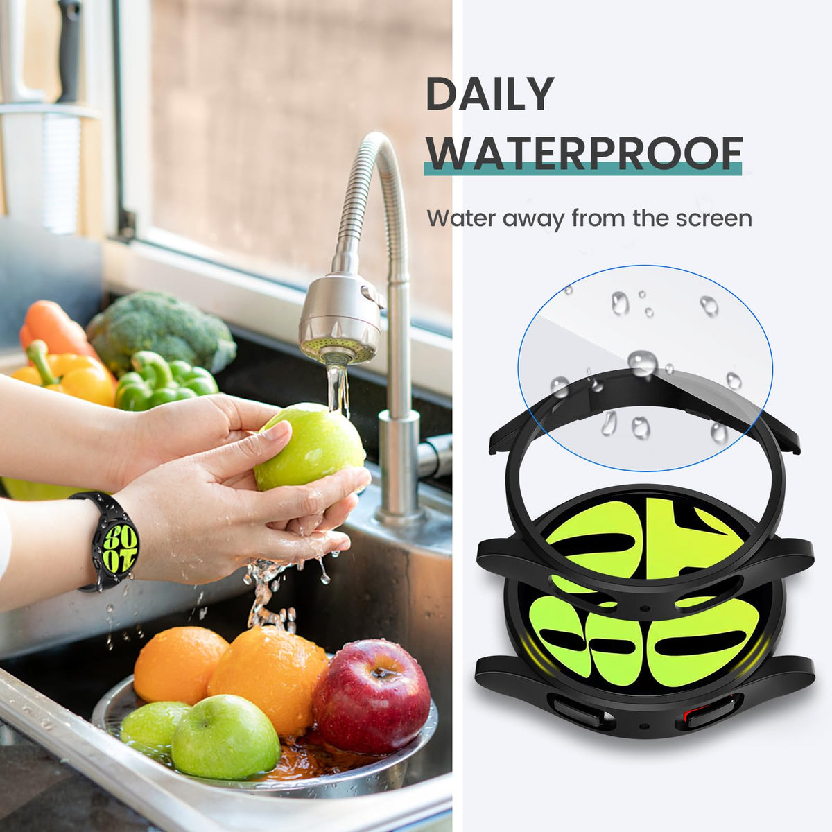 Q: How does the Tensea screen protector prevent fog and water on the touchscreen?A: The Tensea Galaxy Watch accessories feature an anti-fog design that prevents water and fog from affecting the touchscreen, allowing for smooth functionality without the need to remove the case after activities like showering or exercising.