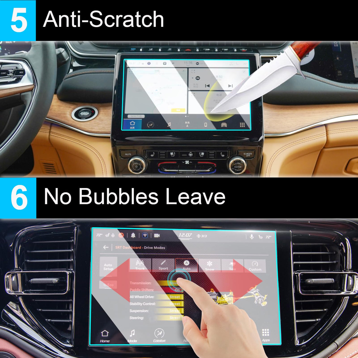 Compatible Vehicles Of Screen Protector: For 2021-2023 Jeep Grand Cherokee L Altitude/Laredo/Limited/Overland/Sumit And Dodge Durango Citadel/Rt/Srt With 10.1-Inch Touchscreen, Does Not Fit 2021-2022 Durango Gt And 2021-2022 Durango 2021-2023. | Advanced Protective Film: Advanced Anti-Explosion Effect, Strengths The Hardness To 9H, Enables To Mitigate The Wallop And Prevent From Scratching. It Does Not Cause Fragmentation And Damage To The Human Body And The Screen Even If It Ruptures, And Still Remain The Whole One Piece. | Upgraded Tempered Glass Screen Protector: The Effect Of Anti-Fingerprint Has Significant Enhanced By Contrast The Traditional Screen Protector. No Longer Fingerprint Leaves On The Screen Protector. | Easy Installation: Aligning The Four Corners And Install It, Then Film Can Be Effectively Installed To The Screen, Without Any Air Bubbles Leaving. Great Structure: The Foil Could Always Keep Wet And Have A Smooth Touch Feel, In Addition, It Can Reduce The Glare Due To There Is A Layer Of Scrub Coating. | Great Structure: The Foil Could Always Keep Wet And Have A Smooth Touch Feel, In Addition, It Can Reduce The Glare Due To There Is A Layer Of Scrub Coating.