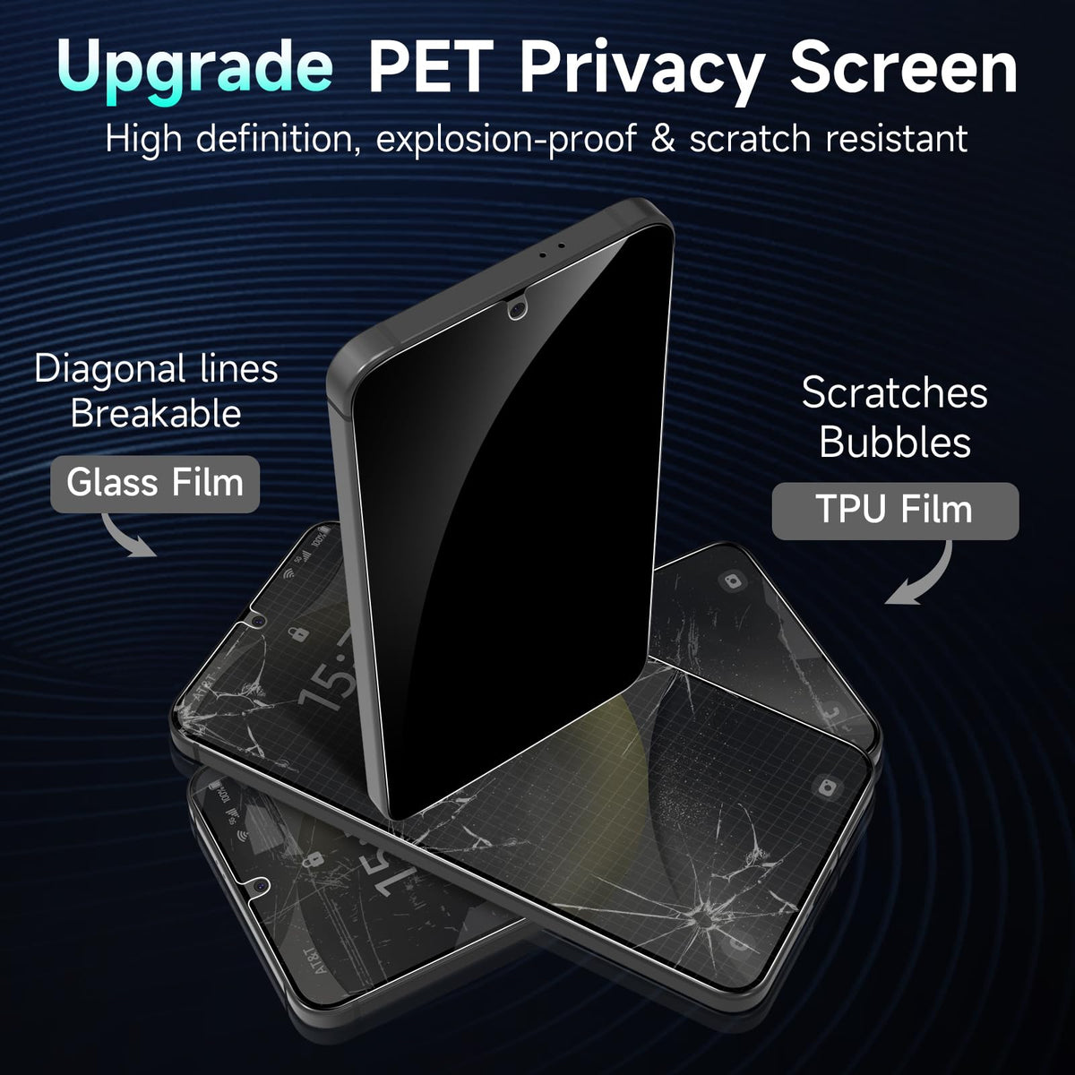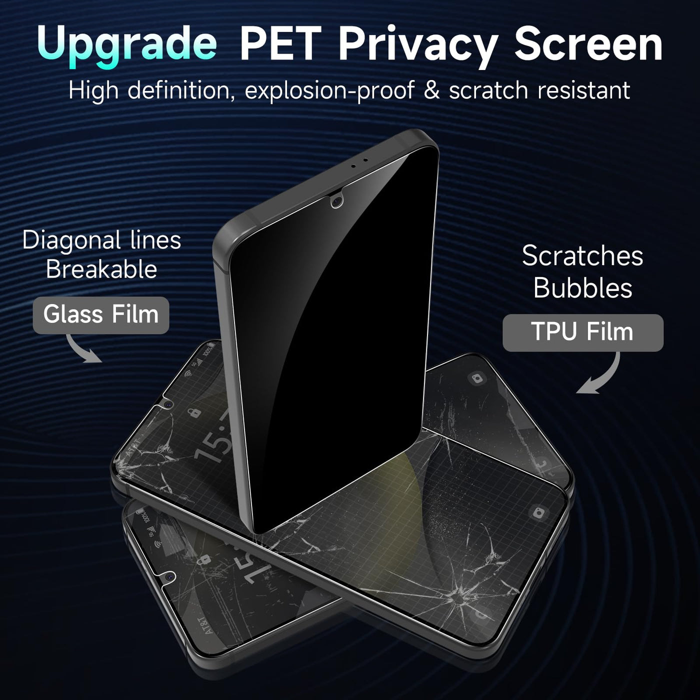 Q: What material is the YWXTW Privacy Screen Protector made from?A: This privacy screen protector is made from high-quality Polyethylene Terephthalate (PET), which offers a balance of durability and flexibility. It provides strong screen protection while maintaining clarity and touch sensitivity.