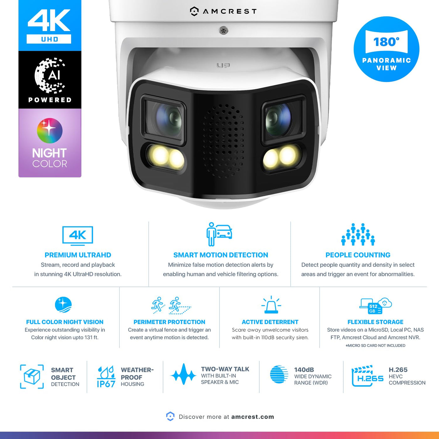 Amcrest Dual Lens 4K (8Mp) Outdoor Security Poe Camera, 2 X 4Mp Lenses Poe Ai Turret Ip Camera, 131Ft Night Color, Human/Vehicle