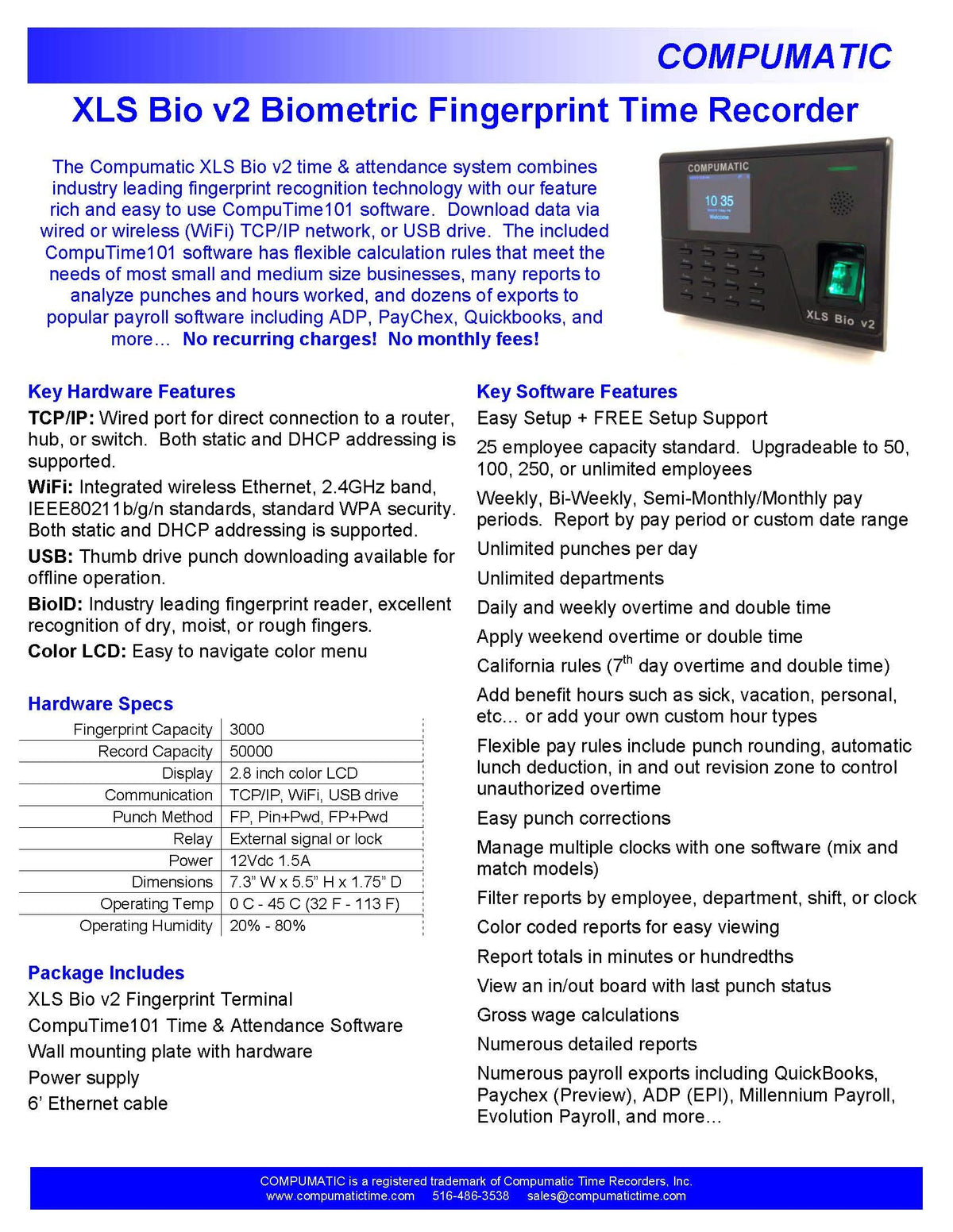 Compumatic Xls Bio V2 Biometric Fingerprint Time Clock System, Wifi, Computime101 Software Included, 0 No Monthly Fees!!