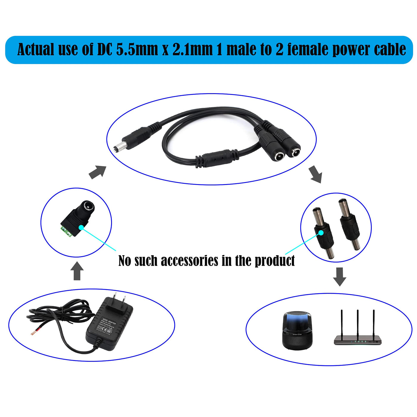 Connector 1: 2 Female Head Connector 2: 1 Male Head Dc Y Splitter Cable Uses One Power Adapter To Power Two Cameraslight Strips,Which Is Convenient And Cost-Effective(Note:Cable Will Only Work With Power Adapter With 55Mm X 21Mm Plug) Description: Widely Used In Surveillance Cameras, Especially For For Home Security Camera Surveillance System, And Other Low-Voltage Dc Electrical Equipment,Carcctv Equipment Specifications: Voltage: 12-24V Power: =60W Wire Gauge: 24Awg Color: Black Cable Length: 30Cm Package: 2Pcs X Dc Y Splitter Cable