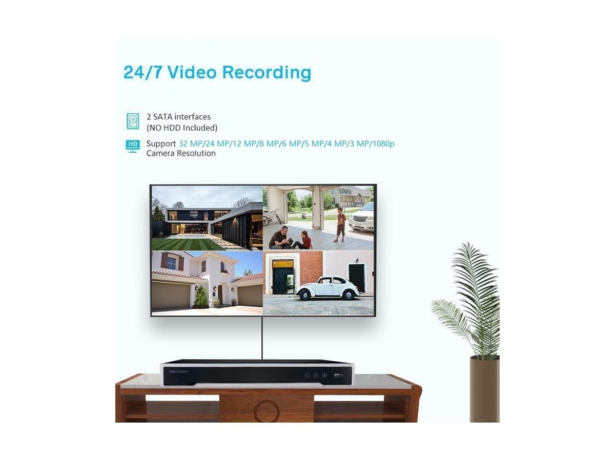 Hikv Ds-7616Ni-M2/16P M Series 16 Channel Poe 8K 32Mp Nvr This Nvr Supports Ip Cameras Up To 32Mp. It Is Equipped With Two Sata Ports That Each Support An Hdd Up To 16Tb, For A Maximum Capacity Of 32Tb. H.265+, H.265, H.264+, And H.264 Video Compressions Keep File Sizes Manageable While Maintaining The Best Quality Possible. This Nvr Supports Two-Way Audio. An Hdmi And A Vga Port Enable Video Output To An External Monitor At Up To 8K Resolution (Hdmi Output Only). Key Features Up To 16-Ch Ip Camera Inputs, 16 Independent Poe Up To 20-Ch@4 Mp Decoding Capacity Up To 256 Mbps Incoming Bandwidth Up To 8K Hdmi Output Supports Raid 0/1/5/6/10, And One-Click To Turn On Raid Mode Support Dual-Os To Ensure High Reliablility Of System Professional And Reliability H.265+ Compression Effectively Reduces The Storage Space By Up To 75% Dual-Stream Recording Saves Bandwidth Adopt Stream Over Tls Encryption Technology Which Provides More Secure Stream Transmission Service Support Double Verification For Playback And Downloading Hd Video Output Provide Independent Hdmi And Vga Outputs Hdmi Video Output At Up To 8K Resolution Storage And Playback Up To 2 Sata Interfaces For Hdd Connection 16-Ch Synchronous Playback Smart & Pos Function Support Multiple Vca (Video Content Analytics) Events Configurable Special Camera Smart Functions, Such As Vca Detection (Motion, Line Crossing, Intrusion, Etc.), Heat Map, Anpr, And People Counting Pos Information Overlay On Live View And Playback, And Pos Triggered Recording And Alarm Network & Ethernet Access 16 Independent Poe Network Interfaces 1 Self-Adaptive 10/100/1000 Mbps Ethernet Interfaces Hik-Connect & Ddns (Dynamic Domain Name System) For Easy Network Management Smooth Streaming Technology