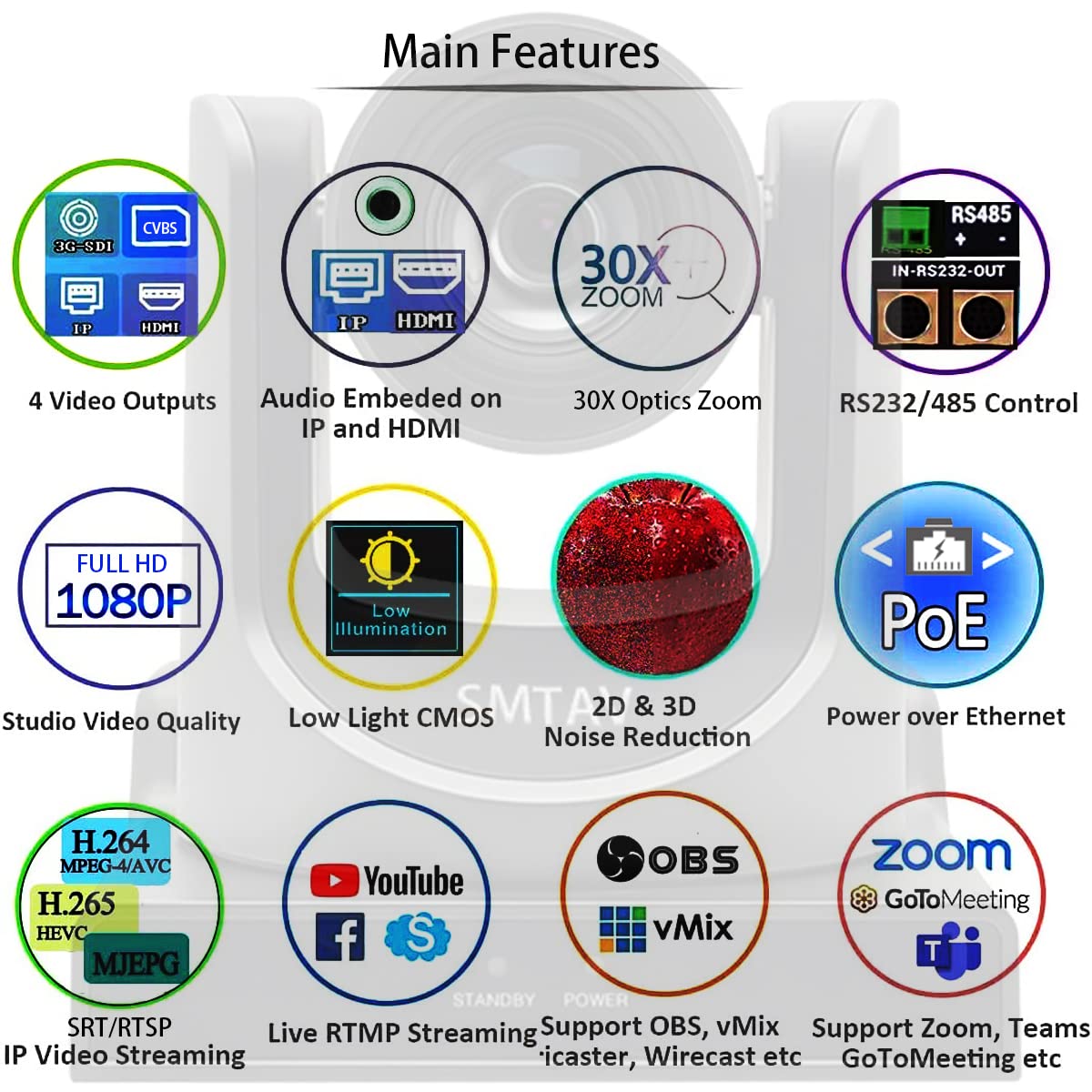 Smtav 30X Optical + 8X Digital Zoom,High Speed Ptz,3G Sdi, Hdmi Output,H.265 Support Video Conference Cameras