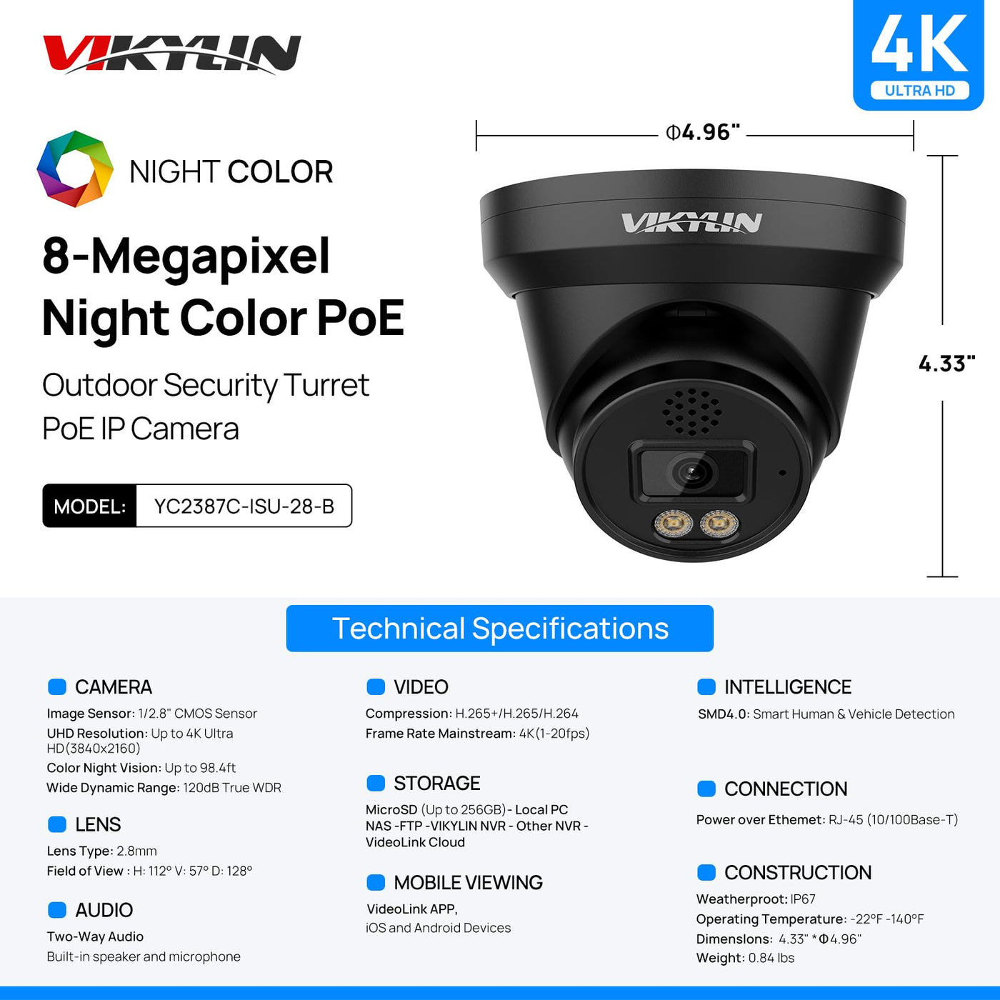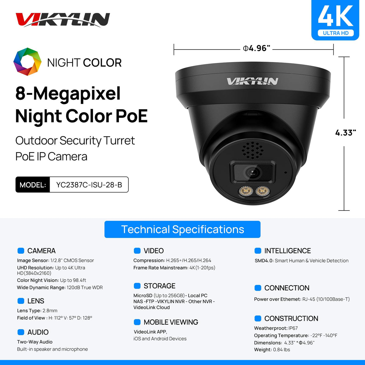 Vikylin 4K 8Mp Full Color Poe Ip Camera, Outdoor 4K Poe Turret Camera With Ai Human/Vehicle Detection, 2.8Mm Lens, F1.0 Aperture