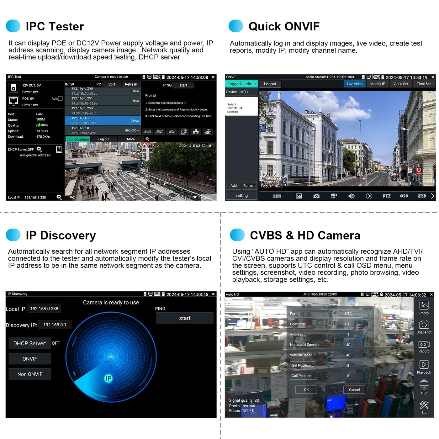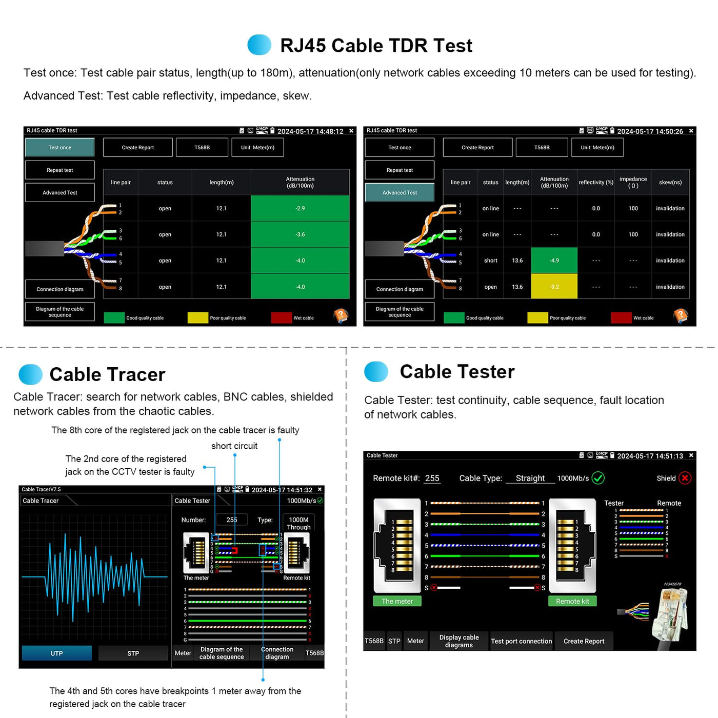 ? Model Ipc-5200C Plus , Cctv Tester Support Coaxial 4.0, Tvi8Mp, Cvi8Mp, Ahd8Mp Camera Image Test, Coaxial Video Control And Menu Calling, Support For Taking Pictures, Recording, Zooming, Playback ? Camera Tester Support H.265+, H.265/H264 Encoding Camera Test, Main Stream Test Image Resolution Up To 4K 1200W Network Camera Test. ? 5.4'' Ips Hd Full-View Ips Capacitive Touch Screen With Higher Brightness And Smoother And Clearer Camera Image Display; ? It Is Powered By An Integrated Polymer Lithium Battery 7.4 V /3350Mah And Can Work Normally For 5 Hours At A Time. ? The Enhanced Version Of Ip Discovery Is Faster And More Accurate! Blind Test, Unknown Ip Camera Can Send Out Ip Address In Seconds, Can Detect Unactivated Haikang Dahua Camera, Click To Jump To The Corresponding Tool To Activate. ? ? Improvement Cable Tester, Utp Cable, Telephone Cable Etc Order And Connectivity Test, Can Save Testing Report, If Special Number, Need Customized. Can Detect The Near-End, Mid-End And Far-End Fault Point Of Rj45 Cable Plug ? Rj45 Tdr Cable Test, Test Cable Pair Status, Length, Attenuation, Reflectivity, Impedance, Skew Etc, Can Create Test Report. ? Digital Cable Tracer, Search Bnc Cable, Network Cable And Telephone Cable From The Mess Cables. Cable Search And Utp Cable Can Test At The Same Time