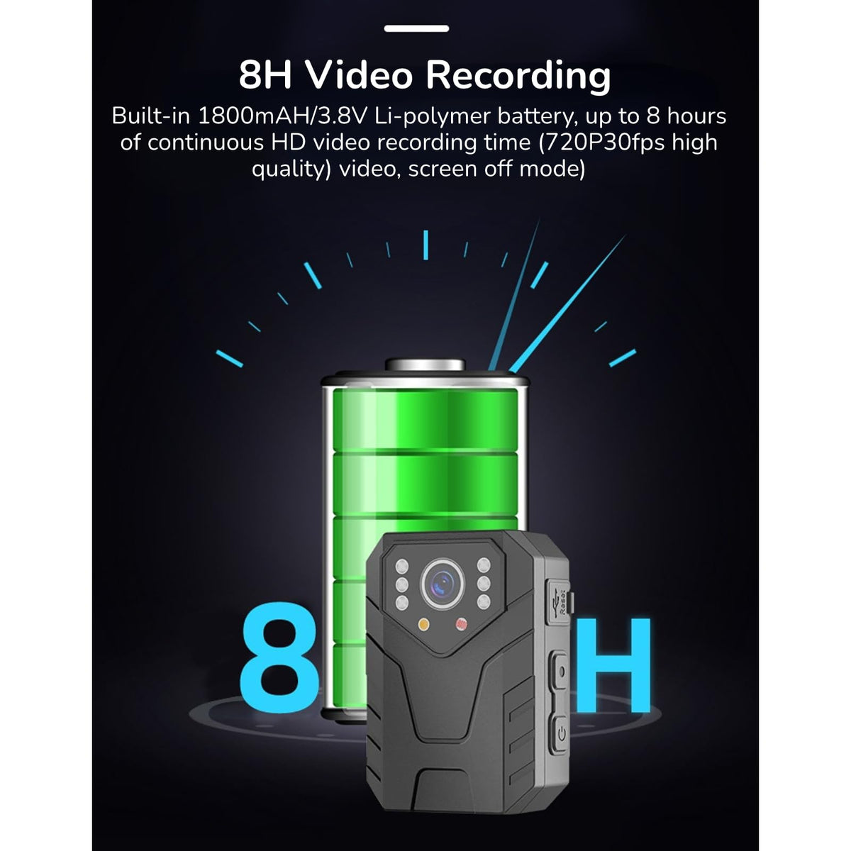 1. 4K Hd Resolution And Motion Detection: High Definition Imaging Lens, Color Fidelity, High Definition Images. Accurately Identify Whether Objects Are Moving And Record More Meaningful Images. 2. High Definition Night Vision: Built In Infrared Light, The Starlight Night Vision Environment Is Still Clear, And The Lens Filter Can Be Switched Between Day And Night. 3. Back Clip Design: The Mini Body Camera Is Very Portable And Easy To Carry With Its Own Back Clip, Making The Video Recording More Convenient, Easy To Clip In Clothes, File Bags, Bags And Exhibition, Etc. Applicable To Security Inspection, Learning Records, Security Patrols, Interview Surveys, Cycling Records, Game Records, Etc. 4. Loop Video Recording: When The Memory Card Is Full, The Newly Recorded Video Can Automatically Overwrite The Original Video; Save Memory Space And Improve Utilization. A Maximum Of 128G Small Memory Cards (Not Included) Are Supported. 5. Long Battery Life: Built In Microphone, Audio And Video Synchronization, Clear Recording At Any Time, Convenient And Fast. Built In 1800Mah Lithium Polymer Battery, Capable Of Sustaining High Definition Video Recording For Up To 8 Hours.