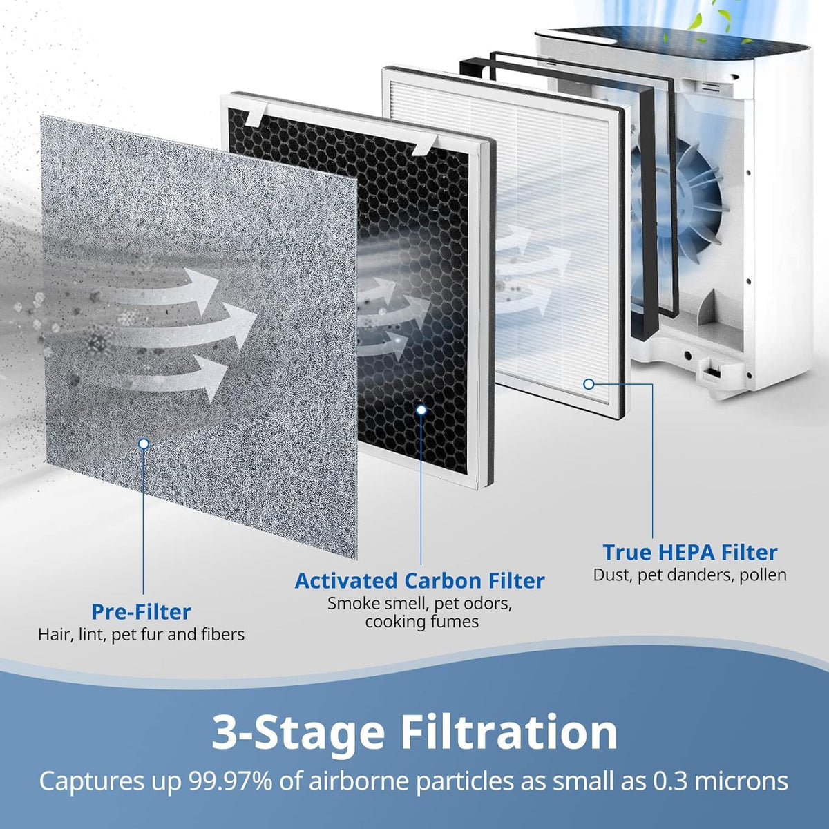 Q: What is the filtration system of the Vital 100 filter?A: The Vital 100 filter features a 3-in-1 H13 Grade True HEPA Filtration System, which includes a washable preliminary filter, a H13 Grade True HEPA filter, and a high-efficiency activated carbon filter, effectively capturing 99.97% of airborne particles down to 0.3 microns.