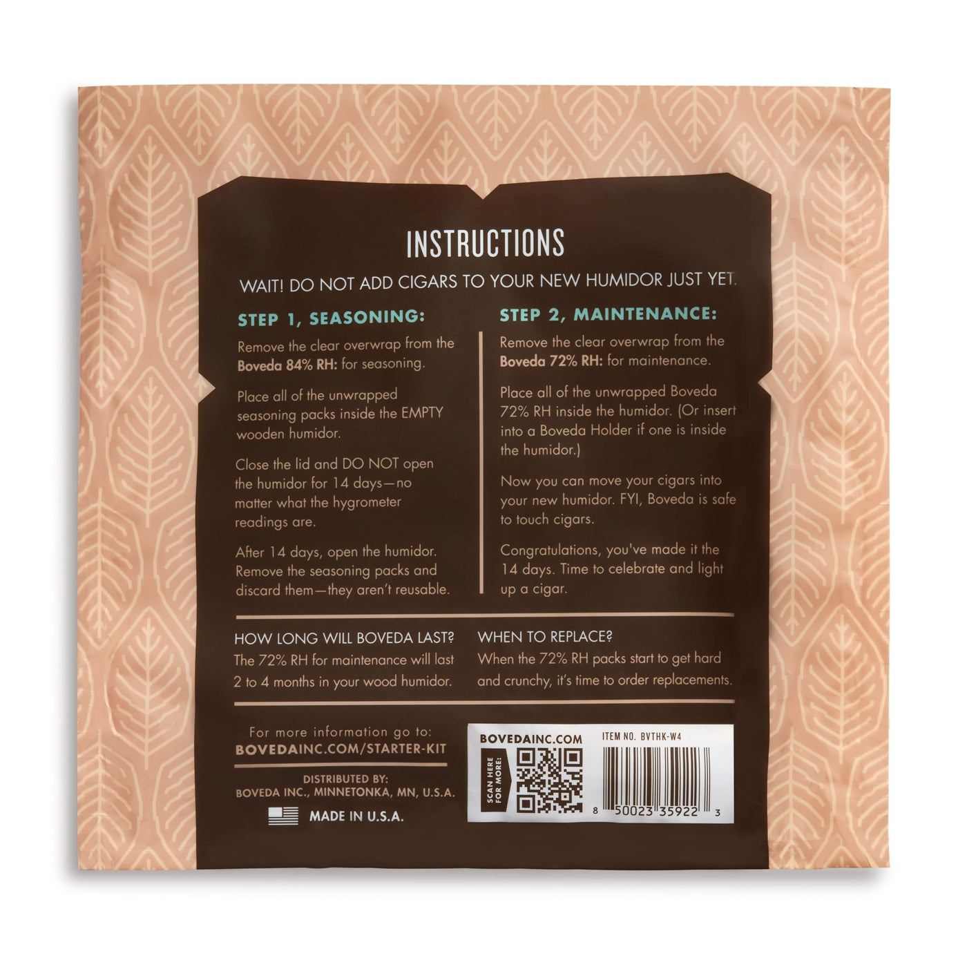 Just Two Steps Until That New Wooden Storage Box Is Ready!. All-You-Need To Season And Maintain A Wood Storage Container Is Now Available In One Easy-To-Use Complete Starter Kit. No More Hassling, Guessing, Or Toiling With Gels, Beads And West, Messy Cloths. Easily Season A Large Wood Storage Box In Just One-Step With The Included Boveda 84% Rh. Nothing To Measure, Fill, Or Spill. Improperly Seasoning With Distilled Water Can Shock And Permanently Damage A Wood Storage Container And Its Seal. Why Season A New Wood Storage Box? Youll Avoid Constantly Battling Low Humidity Levels. Your Goal Is To Help Your Storage Box Achieve 70% Relative Humidity (Rh) To Maintain An Ideal Environment. The Boveda 84% Rh Automatically Gets To Work Gradually Raising The Moisture Level While Precisely Providing Moisture Directly To The Cellular Structure Of The Wood, So It Doesnt Rob Moisture From Your Stored Goods. Creates A Tighter Seal For A Desktop Storage Box. After Seasoning, Dispose Of The Seasoning Packs And Replace Them With The Include Boveda 72% Rh, Which Maintain Ideal Rh In A Wood Storage Container. Lasts For 2-4 Months. For Best Results: Season A New Wood Storage Container With Boveda Before Adding Contents, Then Re-Season A Wood Storage Container 1-2 Times Per Year. Note: Do Not Mix Different Boveda Rh Levels Within The Same Storage Box. And Do Not Use Boveda In The Same Storage Box With Other Humidification Products Because They Will Fight Against Each Other And Reduce The Efficiency Of Boveda.