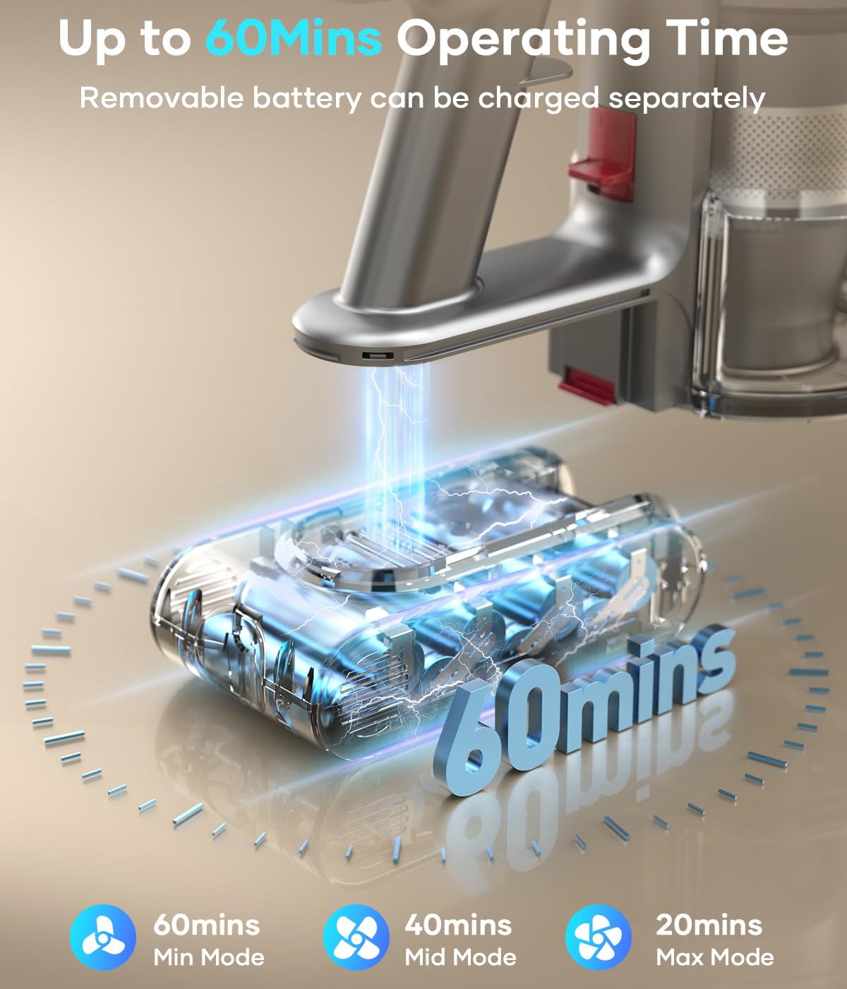 Cordless Vacuum Cleaner, 550W 45Kpa 60 Mins Runtime Vacuum Cleaners For Home With Smart Display, Stick Vacuum With Charging Dock