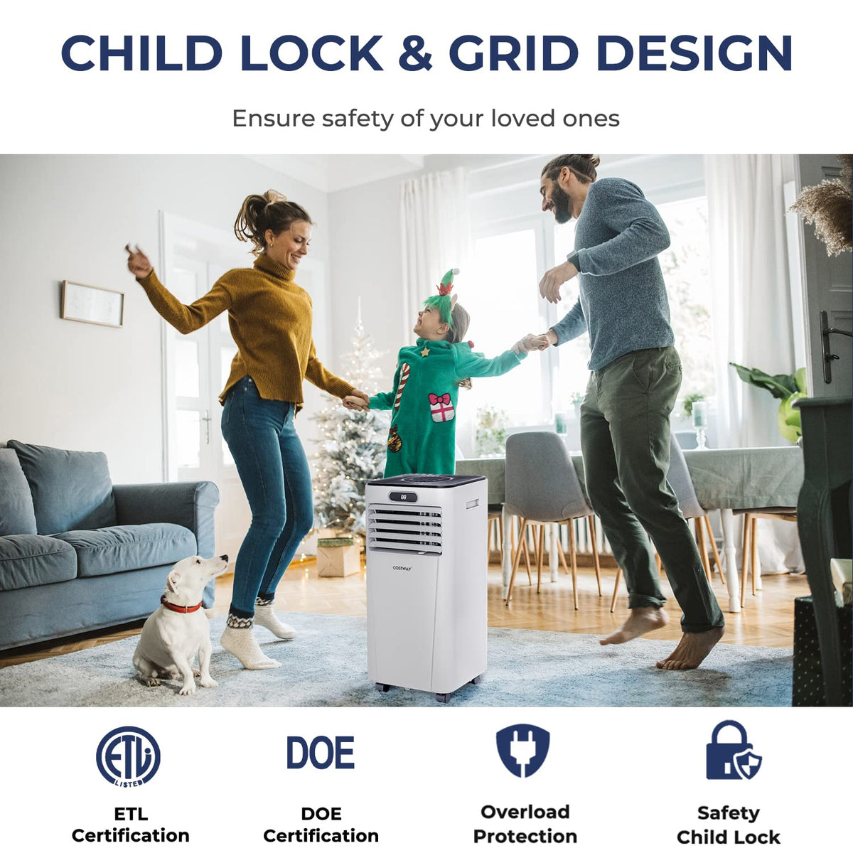 Q: Is the air conditioner safe for families with children or pets?A: Yes, the air conditioner includes a child lock function and a grid design for added safety, making it a safe choice for families with children and pets.