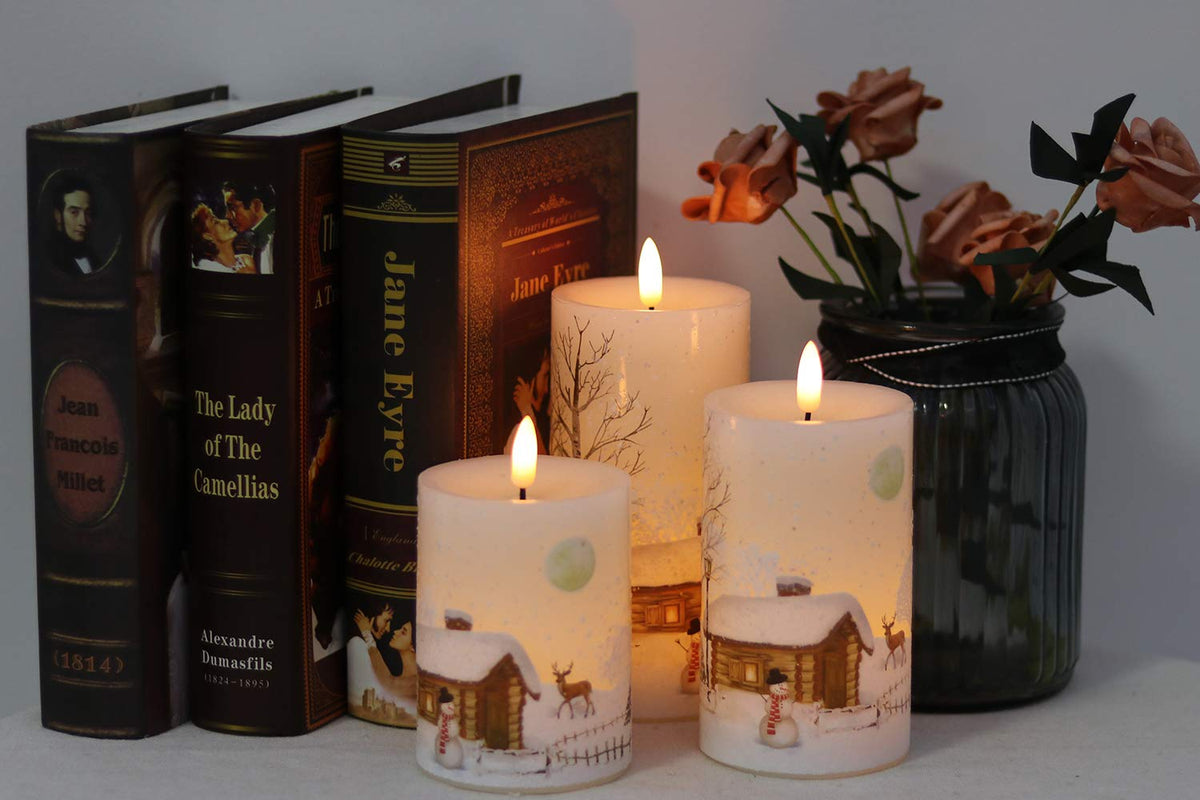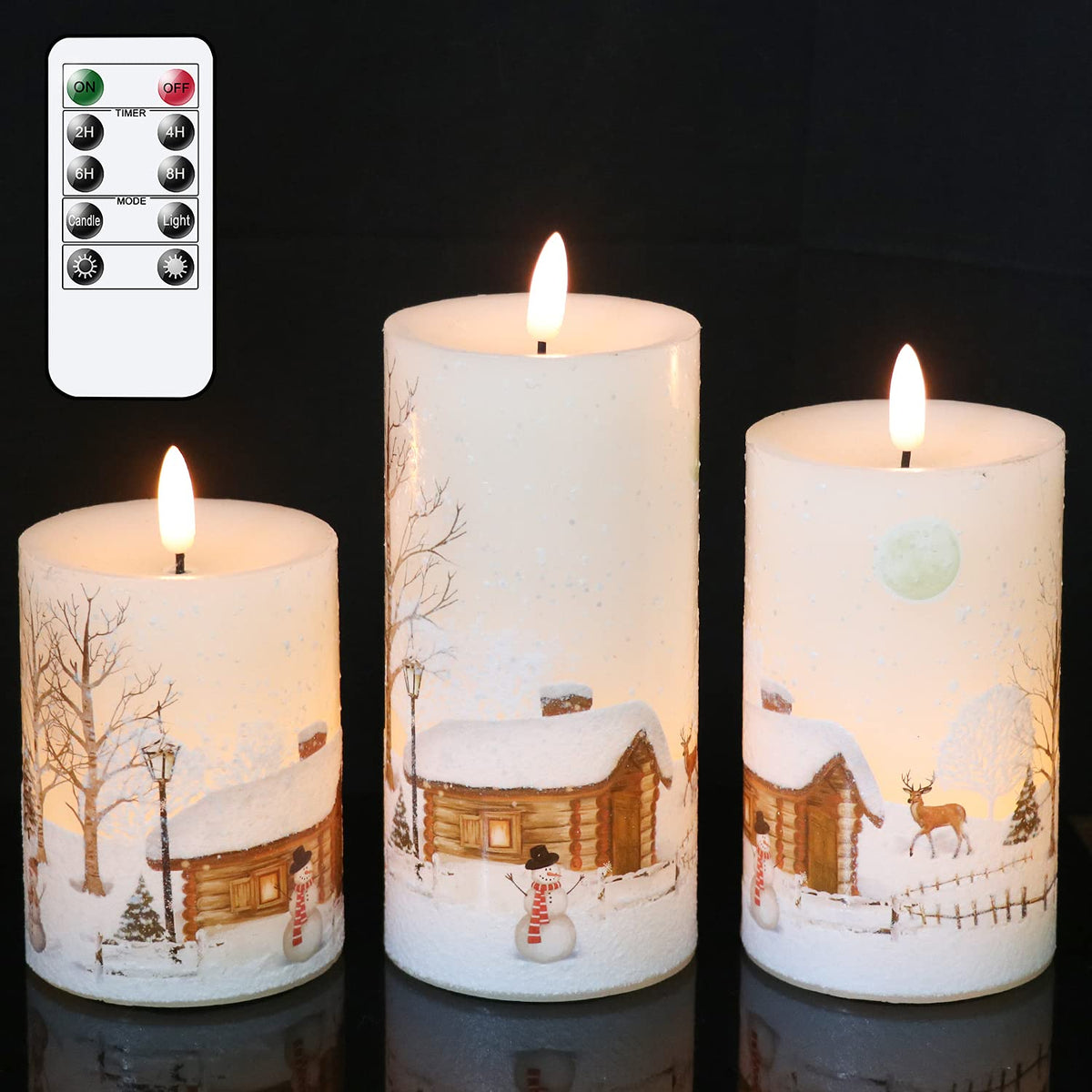 Christmas Flameless Led Flickering Candles Battery Operated With 10-Key Remote And Timer Realistic 3D Wick White Real Wax Holiday Window Candles(Snowman Decal, 3 X 4, 5, 6 Inches)