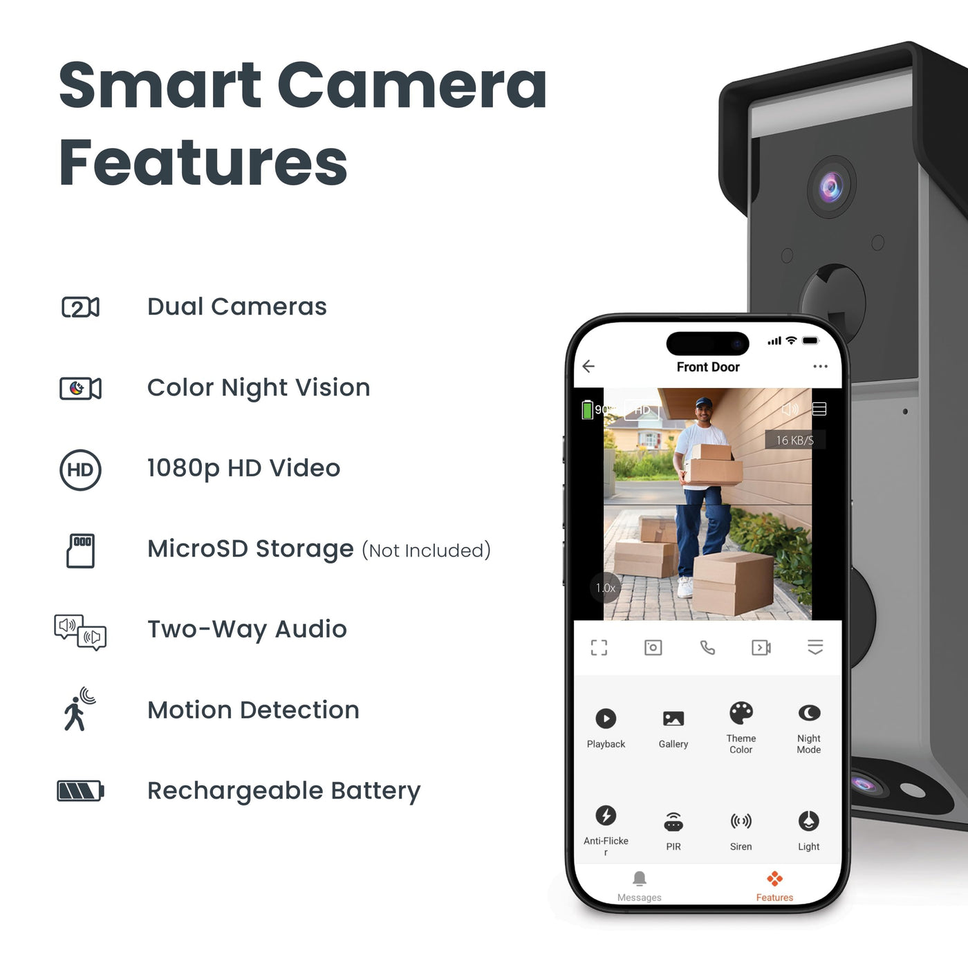 Never Miss A Delivery Again. This Smart Wireless Doorbell With Dual-Lens Camera System From Feit Electric Keeps Track Of Packages Like Never Before, Providing A Crystal-Clear 1080P Hd View Of Both Your Visitor And Any Delivered Packages At Your Doorstep. Unlike Traditional Video Doorbells With Limited Views, This Doorbell Eliminates Blind Spots And Ensures Youll Always Know When A Package Arrives. Enhanced By Intelligent Ai Detection That Prioritizes People And Packages, The Doorbell Minimizes Needless Alerts While Also Allowing For 24/7 Recording With Local Storage On An Sd Card (Not Included) Of Up To 128Gb - So You Can Have Peace Of Mind Even If Your Wi-Fi Goes Down. The Doorbell Boasts A Long-Lasting 4400Mah Battery And Features Easy Plug-And-Play Setup For Immediate Use. See, Hear, And Speak With Visitors From Anywhere With A Mobile Device, And Receive Push Notifications When Activity Is Detected Within A 32-Foot Radius. Capture, Playback, And Share Video And Still Recordings For Added Security. This Feature-Packed Doorbell Offers Day Or Infrared Night Vision Modes For Around-The-Clock Monitoring, And Includes A Wireless Chime For In-Home Notification. Connect To Google Assistant, Alexa, Or Siri Shortcuts For Added Features And Voice Control.