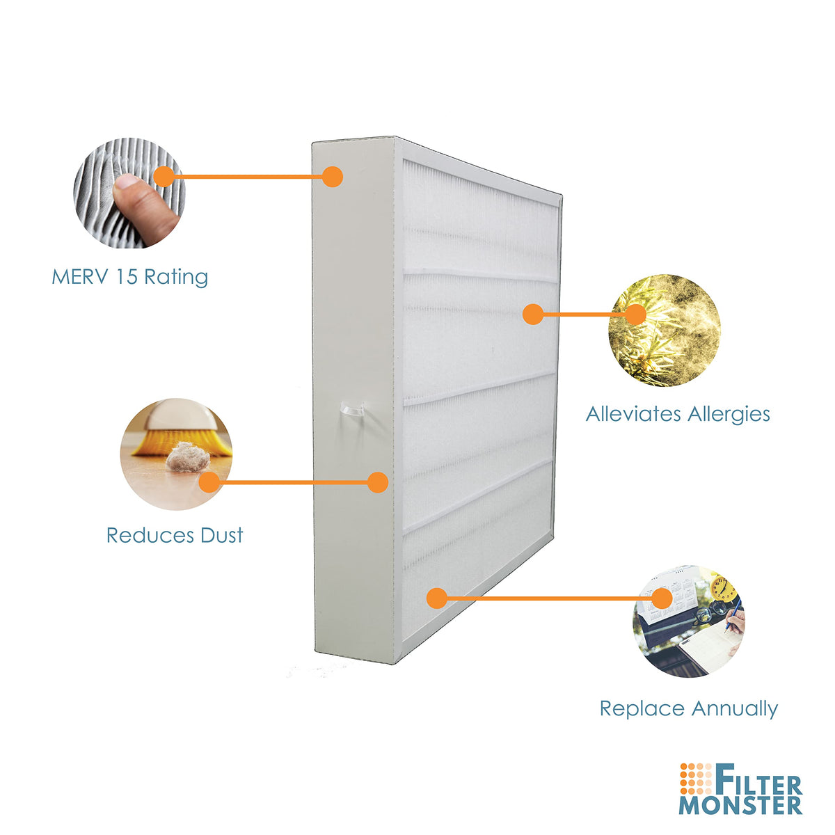 Q: What is the MERV rating of the Filter-Monster air filter and what does it mean?A: The Filter-Monster air filter has a MERV 15 rating, which indicates its ability to effectively capture airborne particles such as pollen, dust, pet dander, mold spores, dust mites, viruses, and bacteria, helping to improve air quality in your home or business.