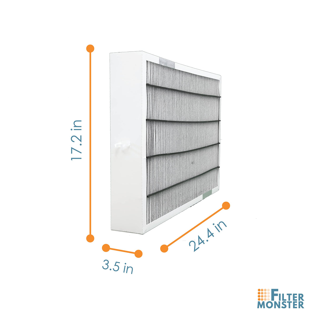 Q: What are the actual dimensions of the Filter-Monster air filter?A: The actual dimensions of the Filter-Monster air filter are 17-1/5 inches x 24-2/5 inches x 3-1/2 inches, making it suitable for HVAC systems that require a filter size of 16 inches x 25 inches x 3-1/2 inches.