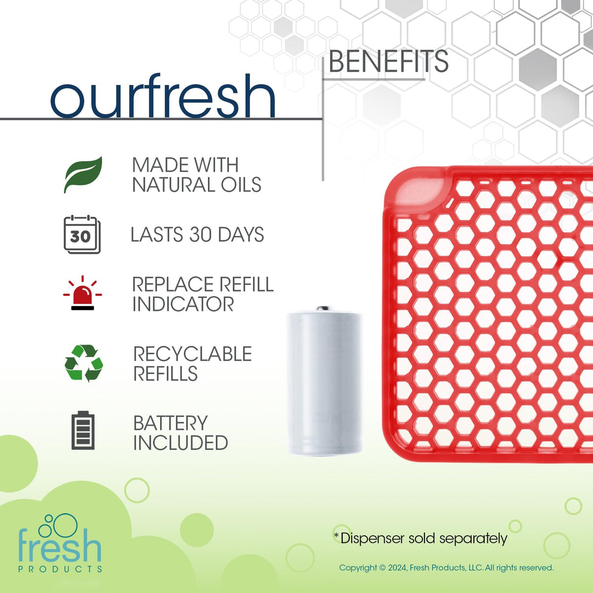 The Modern Solution To Metered Aerosol. Fresh Products Is Proud To Offer Ourfresh, The Dry Fragrance Refills For Medium Sized Spaces With Targeted Air Freshening And Superior Efficiency And Cleanliness. Ourfresh Is Perfect For Any Medium Size Space And Its Light Activation And Preset Program Make It Easy To Use. Created To Be Light Activated So No Fragrance Goes To Waste And Features A Convenient Led Screen That Shows You When Its Time To Replace The Refill. Using Dry Fragrance Technology, Ourfresh Releases Just The Right Amount Of Light Scent Leaving Your World Fresh And Clean Without Fragrance Overload Or Aerosol Residue. Built With Sustainability In Mind, Ourfresh Refills Are 100% Recyclable And Are Part Of Freshs Eco-Refresh Recycling Program. Each Refill Comes With A C-Cell Alakline Battery So You Never Run Out Of Power. Better Air Care. Better Experiences. Freshen Your World With Ourfresh Today.
