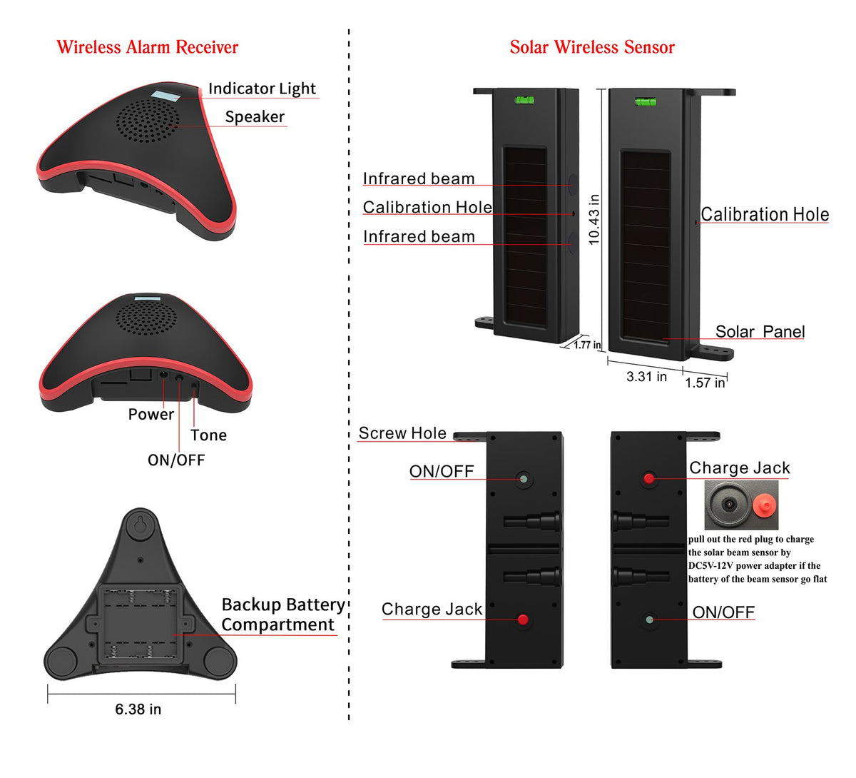 Features: --Fully Expandable System; Up To 32 Sensors Can Be Connected To One Wireless Alarm Receiver, While 1 Sensor Can Be Connected To Unlimited Wireless Alarm Receivers. --The Solar Sensor Is Equipped With Self-Calibration Tools (Calibration Hole), Capable Of Finishing Long Range Calibration In Minutes. --Powered By Built-In Lithium Ion Batteries Those Recharged Through The Solar Panels During The Day,Cloudy And Rainy Days Can Charge The Batteries Normally( (Note: When There Is No Natural Light, The Built In Batteries Can Support 3-5 Days Of System Operation, But The System Is Not Suitable For Long Time Indoor Application). --Waterproof Ip66 Fully-Enclosed Design,Resistance To Rain/Fog/Snow/Etc(Working Temperature Range From -40? To 70?).