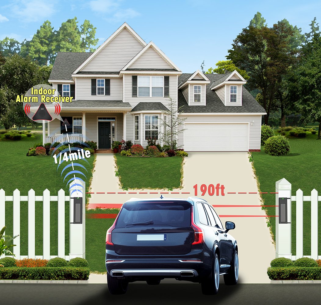 The Infrared Sensing Terminals Of The Solar Sensors Can Be Mounted Up To 190Feet Apart,And Will Send A Wireless Signal Back To The Wireless Alarm Receiver Up To 1/4 Mile Away Anytime The Intruder Passes Between The Sensors;The Solar Sensor Is Powered By Built-In Lithium Ion Batteries Those Are Recharged Through The Solar Panels During The Day, Requires No Wiring And Easy To Install.The Wireless Alarm Receiver Has 4 Wireless Zones And Each Zone Has Its Own Ring Tones(Such As Chime/Doorbell/Etc);It Is The Ideal For All Types Of Outdoor Intrusion Alarm Application,Such As Driveway/Fence Tops/Windows/Etc.