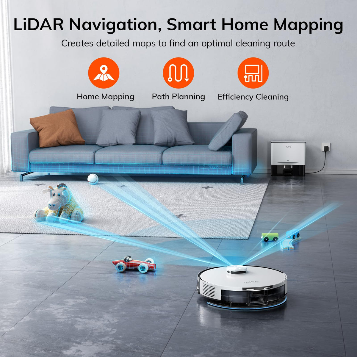 Precision Lidar Navigation: The A30 Pro Self Emptying Robot Vacuum Cleaner Utilizes Advanced Lds Laser Technology And The Slam Algorithm, Enabling It To Generate Accurate Maps Of Your Home And Plan Optimal Cleaning Routes, Ensuring Higher Coverage And More Efficient Cleaning | Up To 280 Days Of Hands-Free Cleaning: Ilife A30 Pro Vacuum Robot Comes With A Self-Empty Station And 5X2.5L Capacity Dust Bags. Each Bag Can Handle Dust And Debris For Up To 8 Weeks, With 5 Bags That Means Up To 40 Weeks (280 Days) Of Cleaning. The Self-Empty Station Automatically Empties The Collected Dust And Debris Into The Dust Bag After Each Cleaning, Eliminating Frequent Manual Disposal | Smart Ilifeclean App Control: Control The A30 Pro Robotic Vacuum Effortlessly Via The Ilifeclean App. You Can Set Up No-Go Zones, Virtual Walls, Cleaning Schedule, Select Rooms Or Areas To Clean, And Adjust The Water Level And Suction Power According To Your Specific Cleaning Requirements. Note: It Only Supports 2.4Ghz Wifi Network | Powerful 5000Pa Suction: A30 Pro Robot Vacuum Cleaner Features A Roller Brush, Effortlessly Picks Up Dirt, Debris And Pet Hair From Carpets And Hard Floors. You Can Choose Among Four Suction Modes To Clean: Quiet (500Pa), Standard (1000Pa), Strong (1800Pa), And Max (5000Pa) | Sweep, Vacuum And Mop 3-In-1 : A30 Pro Robot Mop Features A 2-In-1 Integrated Water Tank That Consists Of A 200Ml Dustbin And A 200Ml Water Tank, This Setup Enables It To Vacuum And Mop Simultaneously Without The Need To Replace The Dustbin And Water Tank, Effectively Reducing Cleaning Time By 30%. Note: If You Dont Want It Mop, Just Remove The Mop Holder