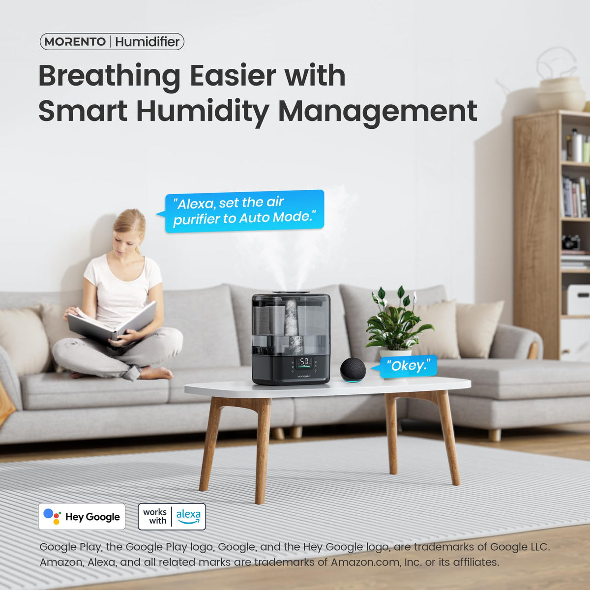 Morento Mr6W Smart Cool Mist Humidifiers For Bedroom Engineered With A Spacious 6L Water Tank, It Offers Up To 50 Hours Of Continuous Operation, Enhanced By Dual Nozzles That Evenly Disperse Humidity Throughout Large Rooms. Stay Informed With Live Humidity Updates Displayed On The Sleek Led Screen, Accompanied By A Smart Comfort Indicator That Guides You To The Optimal Environment With A Simple Glance. Personalize Your Experience With Three Adjustable Mist Levels, Let The Intelligent Auto Mode Intuitively Adapt To Your Needs, Or Manually Set The Humidity Level Within A Broad Range Of 30% To 80%. Enjoy Added Convenience Through A Programmable Timer And A Considerate Sleep Mode That Combines Dimmed Lights And Whisper-Quiet Performance For Undisturbed Rest. Indulge In Moments Of Tranquility As A Gently Cycling 7-Color Night Light And Integrated Aromatherapy Infuse Your Space With Calming Hues And Your Preferred Essential Oils. Embrace Unparalleled Relaxation And Air Quality Improvement With This Feature-Packed Humidifying System.