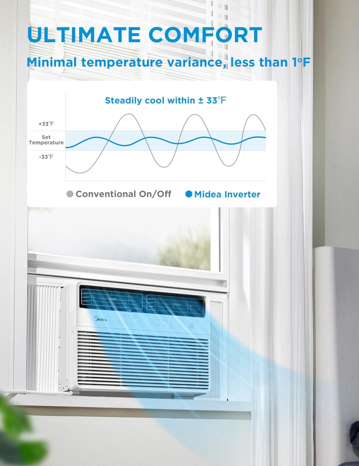 Midea 12,000 Btu Smart Inverter Window Air Conditioner With App, Alexa Control, Cools Up To 550 Sq. Ft., Quiet Operation, Energy Saving, Remote & Easy Installation Kit, White Stay Cool And Connected Experience Next-Level Comfort With The Midea 12,000 Btu Smart Inverter Window Air Conditioner, Designed To Efficiently Cool Rooms Up To 550 Sq. Ft. Seamlessly Control Your Climate Via The Smarthome App, Alexa Voice Commands, Or The Included Remote-Perfect For Modern, Tech-Savvy Homes. Ultra-Quiet & Energy-Efficient Cooling Enjoy Peace With Noise Levels As Low As 42 Db. The Advanced Inverter Technology Optimizes Energy Use, Reducing Power Consumption More Than 38% Compared To Traditional Units, Saving You Money While Keeping Your Space Comfortably Cool. Smart Control, Anywhere Access Adjust Settings From Anywhere Using Your Smartphone With The Midea Air App (Ios/Android). Sync With Alexa For Hands-Free Voice Commands Like, Alexa, Set The Ac To 72F -No Need To Leave Your Couch! Powerful, Precise Cooling The 12,000 Btu Capacity Delivers Rapid, Even Cooling For Spaces Up To 550 Sq. Ft. Customize Comfort With 3 Fan Speeds, A 24-Hour Timer, And Eco Mode. The Auto-Swing Louvers Distribute Air Evenly, Avoiding Direct Drafts For A More Pleasant Environment.