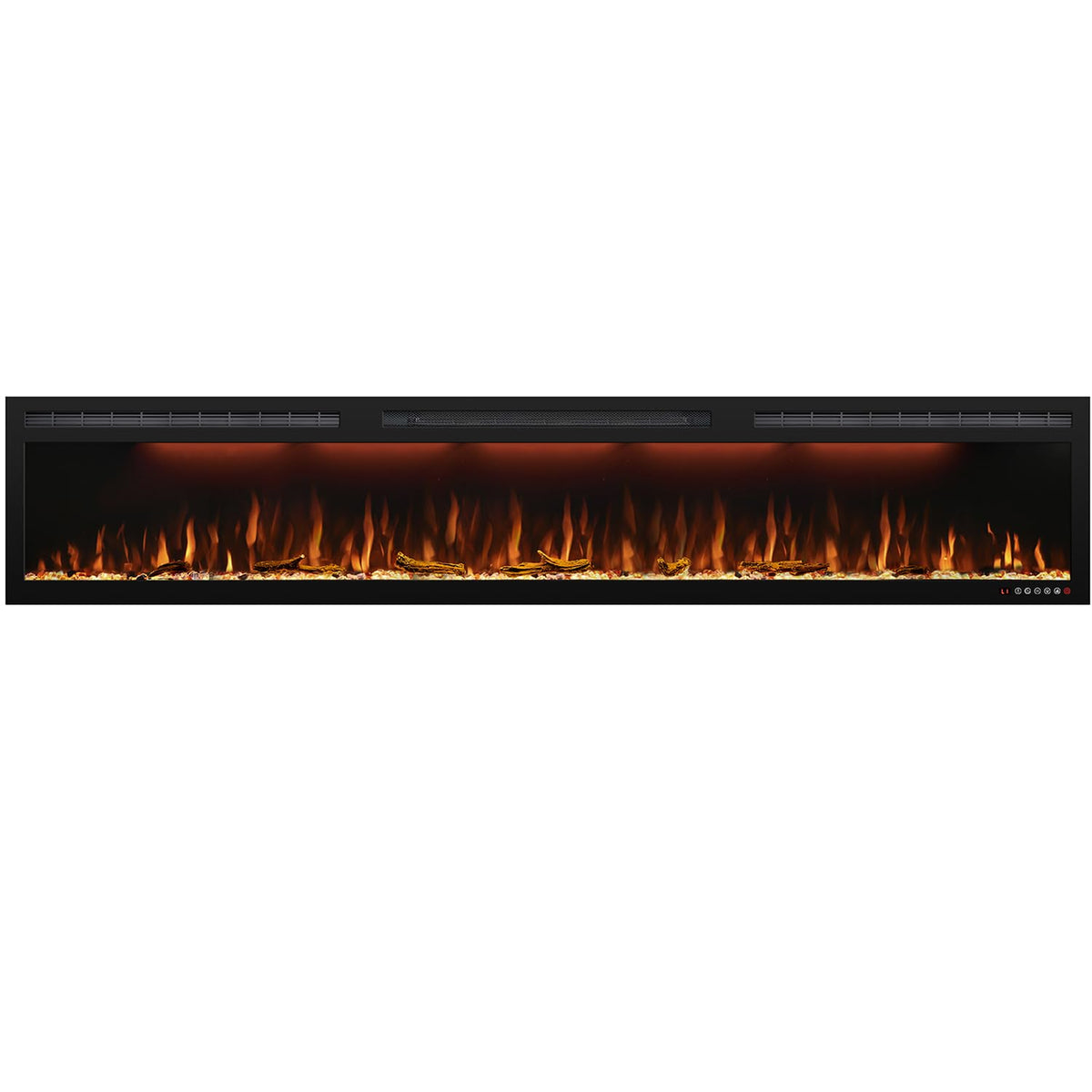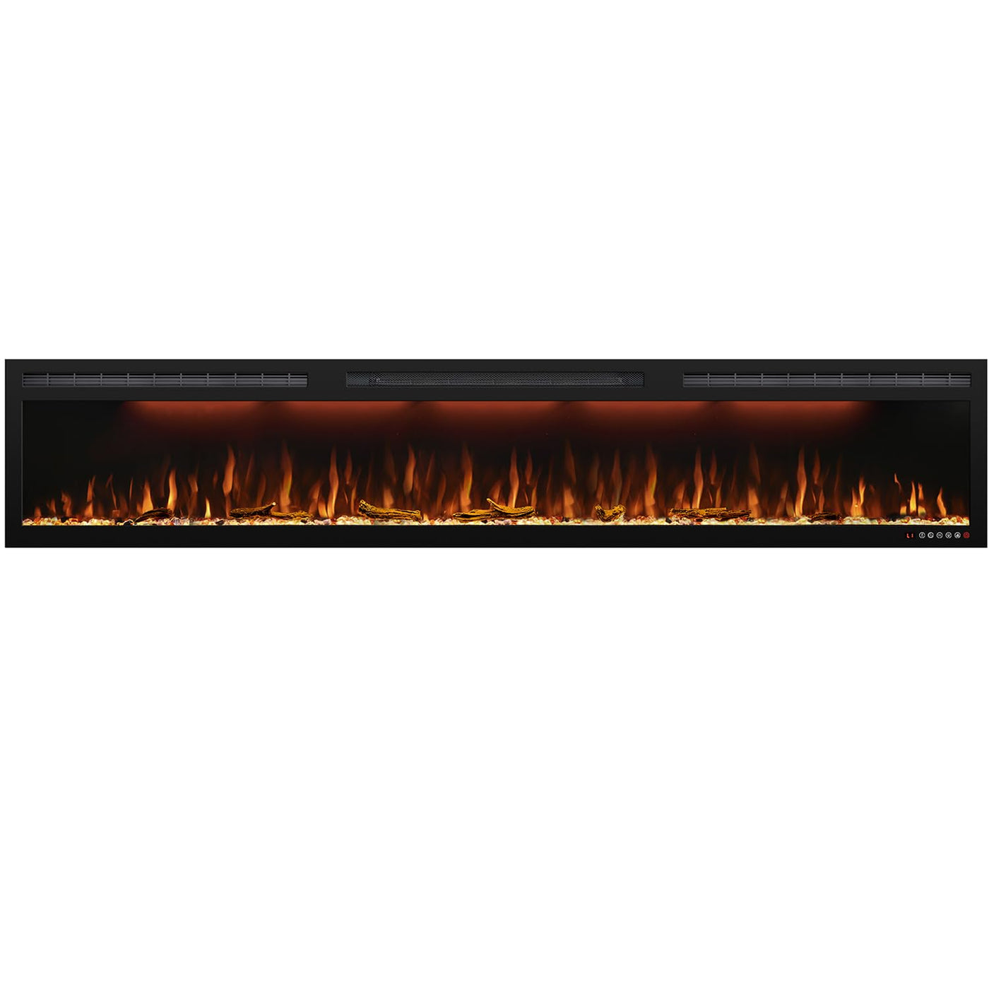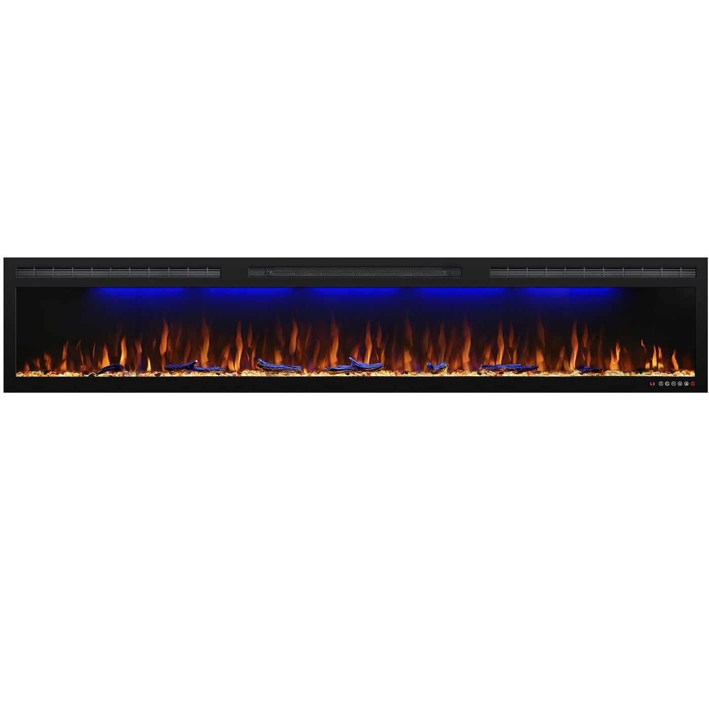 Mystflame Electric Fireplace, In-Wall Recessed And Wall Mounted Fireplace Heater, 88 Inch Wide Slim Frame Fireplace With Log & Crystal Hearth Options, Multicolor Flame, And Remote Control Features Faux Fire Log & Glass Crystal Sets In-Wall Recessed & Wall Mounted Fireplace Stylish Slim Frame Design Realistic Flame Effects With Personalized Setting 750 W/1500 W Heat Setting Option With Front Air Vent 62F To 86F Temperature Adjustment To Meet Different Needs Overheat Protection Device, Automatically Cut Off When The Temperature Is Too High Built-In Timing Function Can Set The Time From 1 To 9 Hours Remote Control Is More Convenient For You Touch Screen Panels With Lcd Display For Control All The Functions Specification: Dimensions: 88 L X 5.96 W X 17.72 H; 88 Built-In Electric Fireplace Flame Effect: Log Sets And Crystal Flame Effect For Option Material: Black Tempered Glass Panel & Sheet Metal Flame Color: 9 Multi-Color Modes Timer: 1-9 Hours Timer Coverage Area: 450 Square Feet Power Cord Length: 6L Display Area: 56.5 L X 10.8 H G. /N. Weight: 52.36 Pounds/73.26 Pounds Temperature Setting Range: 62F To 86F Adjustable Power: 750/1500 W Input Voltage:110-120 V One Year Warranty Included Package Includes: 1X Electric Fireplace (Need To Be Self-Assembled) 1 X Remote Control 1 X Crystals 1 X Metal Bracket 1 X Screw Kit 1 X Manual 1 X Customer Service Card Note: This Heater Is Hot When In Use. To Avoid Burning, Do Not Let Bare Skin Touch The Hot Surface. Please Keep Combustible, Paper, And Fabric Materials At Least 3 Feet(0.9 M) Away From The Fireplace.
