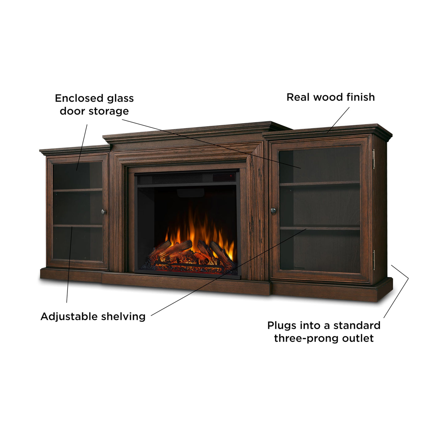 The Fredericks Pronounced Firebox Trim, Bordered Glass Doors, And Rich Finish Options Add To The Antique Feel Of This Classic Entertainment Mantel. Capable Of Safely Supporting A Television Of 100 Lbs. Or Less While Adjustable Shelving Accommodate Most Electronics And Other Objects. The Vividly Electric Firebox Plugs Into Any Standard Outlet For Convenient Set-Up. The Features Include Remote Control, Programmable Thermostat, Timer Function, Brightness Settings, And Ultra Bright Vivid Flame Led Technology. Available In Blackwash, Chestnut Oak, And White Finishes.