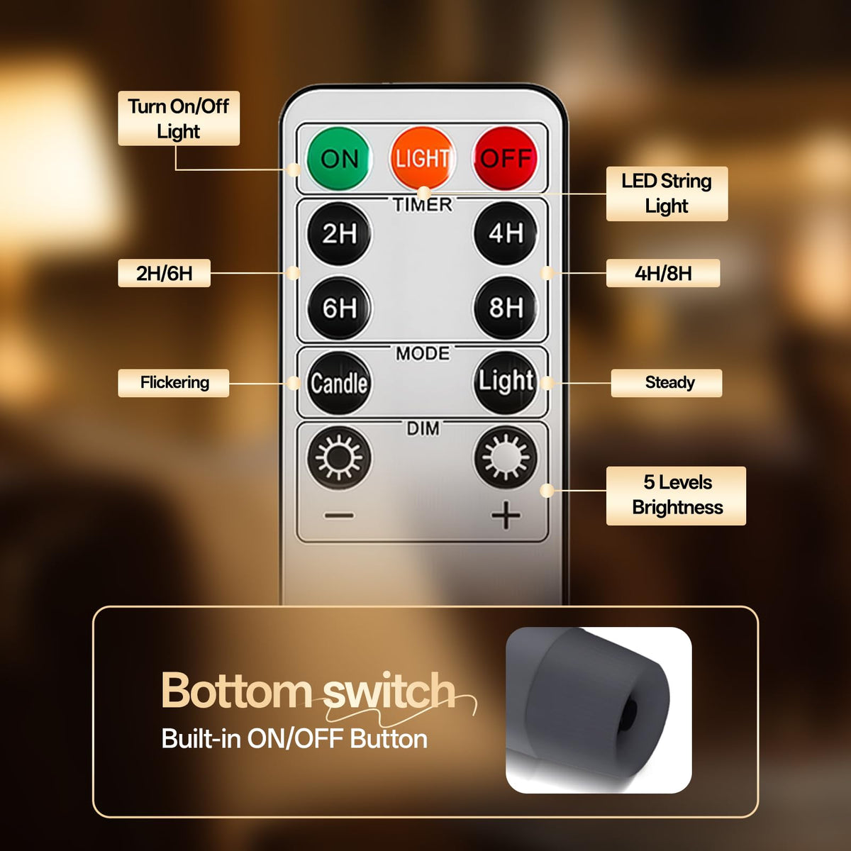 Battery Operated Flameless Taper Candle Specification: Style: 3D Flame Design With 11 Mini Starry String Lights Led Light: Warm Yellow Material: Abs Plastic + Electronic Components Features: Flameless, Flickering, Remote Control, Timer, Dimmer Battery Operated Design: Powered By 2 Aa Batteries (Not Included) Practicality: For Fireplace, Windowsill, Table Centerpiece, Beside Table, Porch, Garden And Anywhere You Needed