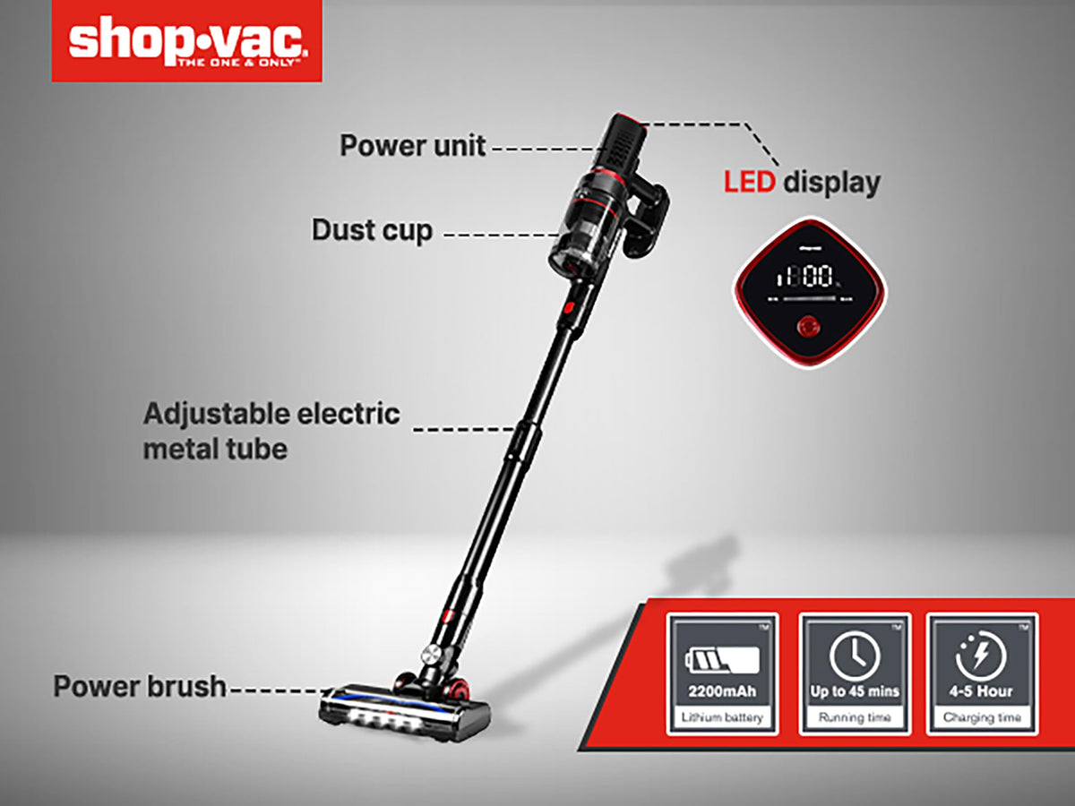 Power: 350W, Voltage: 25.9V, Tank Capacity: 0.5 Liter, Vacuum Pressure: 8-25K Filtration System: Sponge, Power Cord Length: 5.0 M, Running Time: 15-55 Mins, Charging Hour: 2-3H, 100,000Rpm. Brushless Dc Motor, 3 Speed Powerful Suction, Adjustable And Extendable Rod