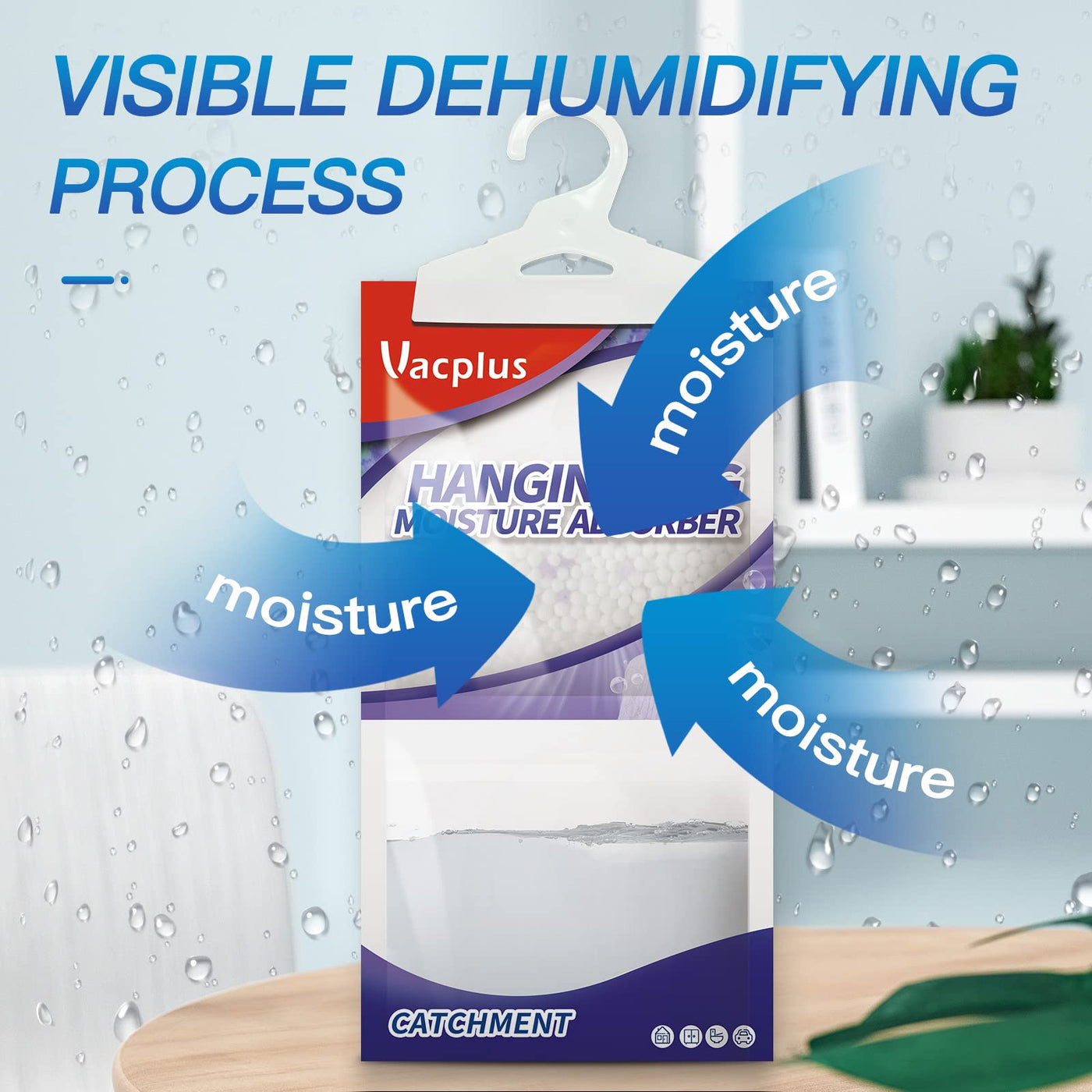 Looking For A Solution To Repel Dampness Vacplus Hanging Moisture Absorber Bags May Be A Great Option 1 The Moisture Absorbers Feature A Large Capacity Of 98-Oz Spherical Calcium Chloride And Lavender Fragrance, Which Can Not Only Effectively Absorb Extra Moisture From The Air But Also Remove The Unpleasant Smell 2 These Safe Moisture Absorbers Come With An Independent Transparent Moisture Collecting Bag At The Bottom, Which Shows You The Increasing Moisture Day By Day It Is A Visible Working Process 3 The Moisture Remover Bags Are Equipped With A Strong Hook To Hang Anywhere You Want You Can Hang Them In The Area Where The Air Is Moist, Stale, And Stagnant, Then They Will Start Working Instantly With The Aroma Of Lavender But The Calcium Chloride Particles May Take A While To Dissolve, Please Be Patient