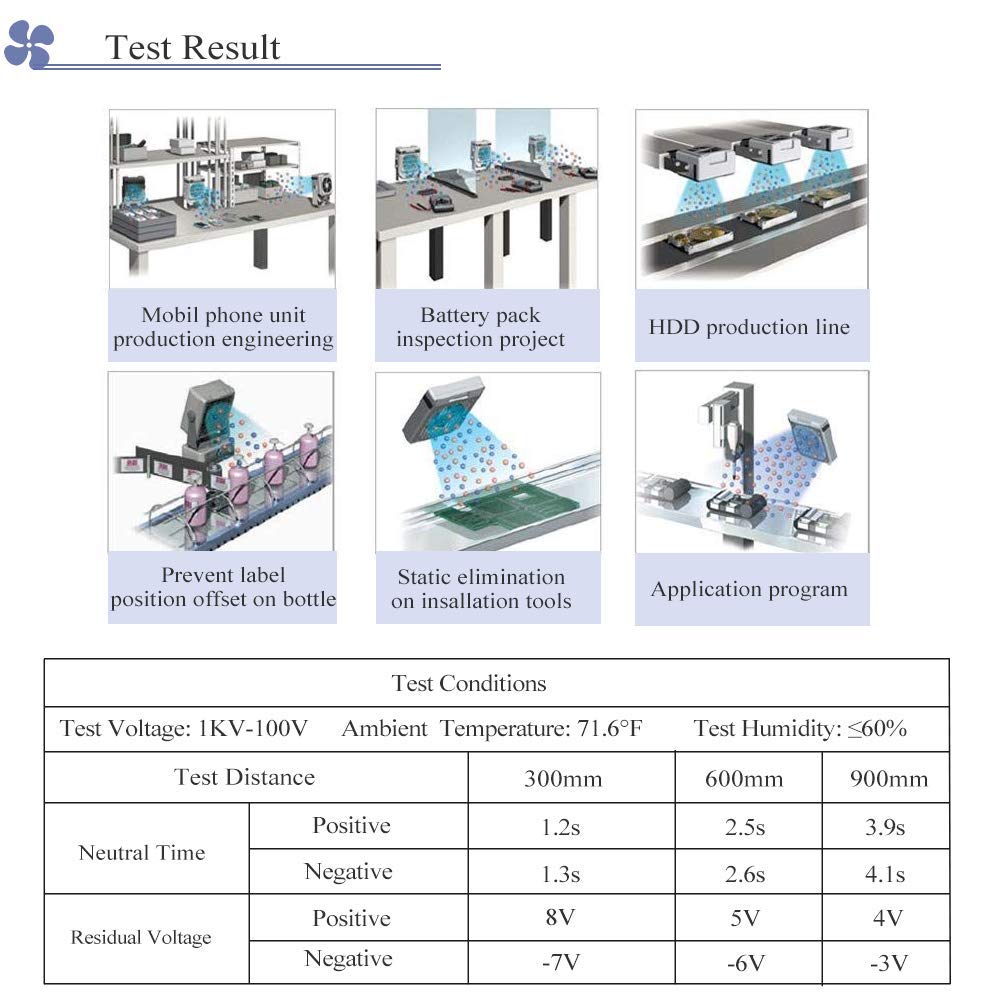 If You Have Any Question, Please Feel Free To Contact Us, We Will Try Our Best To Help You.Description The Yuchengtech Ionized Air Blower Produces An Air Flow That Is Rich In Positive And Negative Ions. Directing The Air Flow On An Object That Has Static Electricity Charge Will Neutralize The Charge. If The Object Has A Negative Static Charge ,It Will Draw Positive Ions From The Air Flow. Conversely, If The Object Has A Positive Static Charge , It Will Draw Negative Ions From The Air Flow . The Air Ions Are Attracted To The Oppositely Charged Object And Neutralize The Charge On The Object.It Is Suitable For Eliminating Static Electricity In A Small Range, Convenient For Movement And Installation, And Can Continuously Adjust Wind Speed. Specificationcurrent Consumption:0.25A Or 0.12A Air Velocity: 45Cfm-110Cfm (Air Flow Adjustable) Air Flow Characteristics: 40Cm*60Cm (30~45Cm Installation Distance) Operating Temperature: 0~50?Ion Balance(Offset Voltage): 010 V.Silica Gel Power Cord Length: 1.7Mion Needle Material: Pure Coppernoise Level: