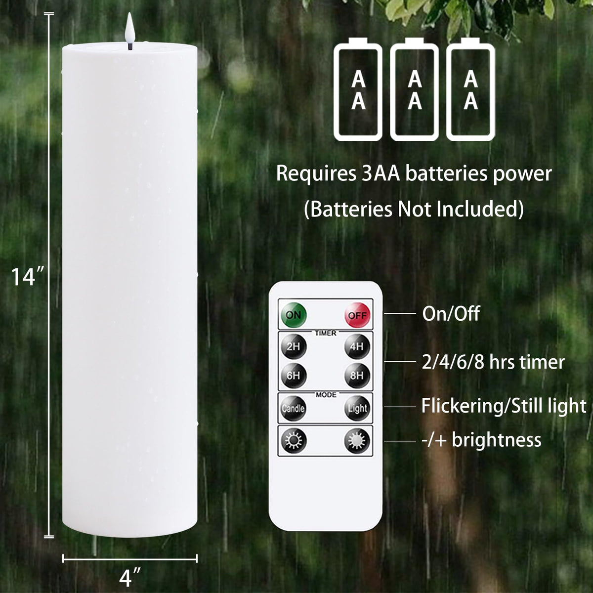 Zevanor Led Pillar Candles Information: What You Get: 1 Waterproof Led Candle, 1 Manual, 1 Remote Control Candle Size: 14 H X4D Candle Colors: White Made Of: Plastic Candle Wick: Teardrop Wick Color Of Wick: Warm Light Special Feature: Ip55 Waterproof, No Flame, Candle Mode, 24 Hours Cycle Timer, Increase/Decrease Brightness