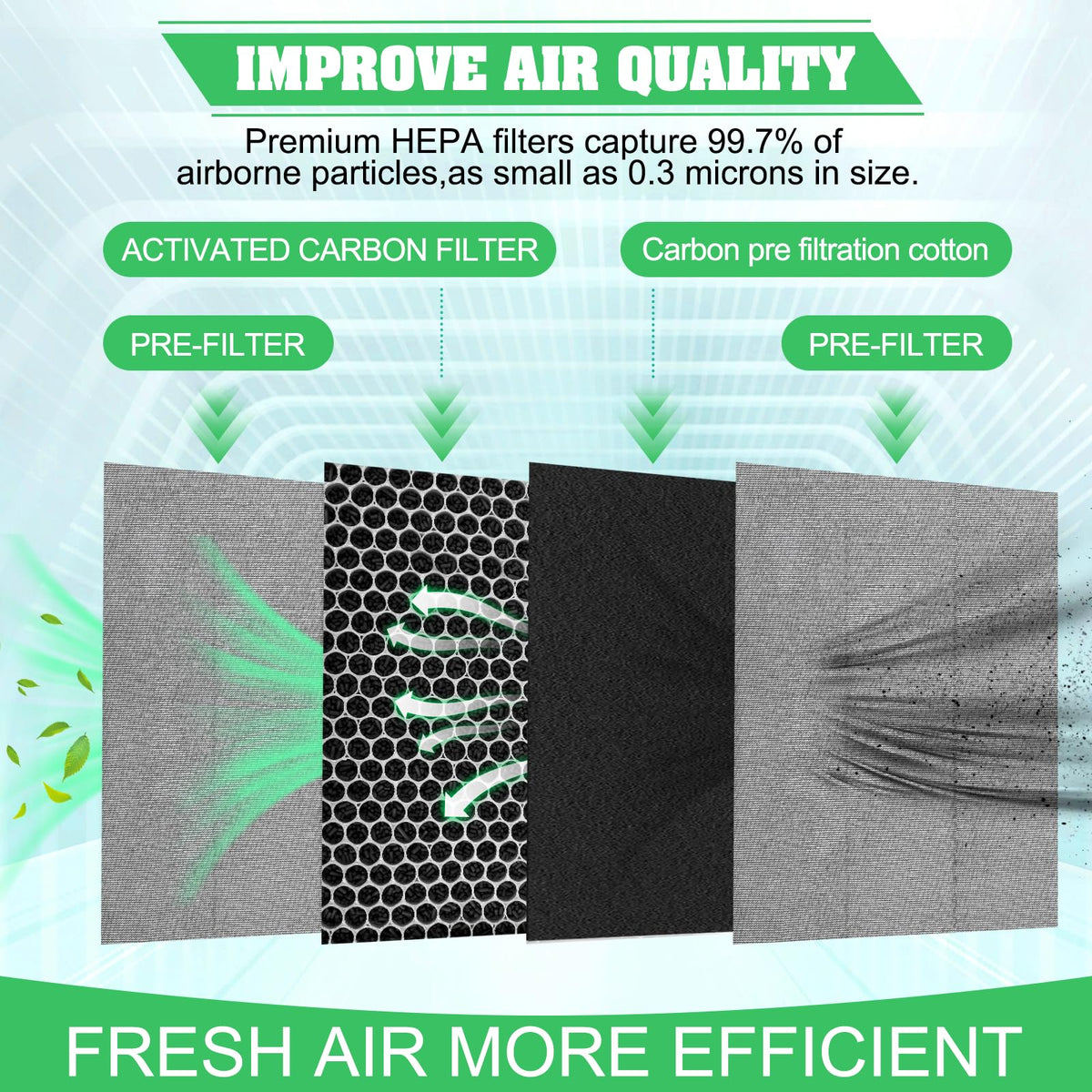 Q: What materials are used in the KC850U filter?A: The KC850U filter features a high-efficiency 3-in-1 design, utilizing H13 medical grade true HEPA technology along with activated carbon for superior filtration of allergens, pet dander, and dust.