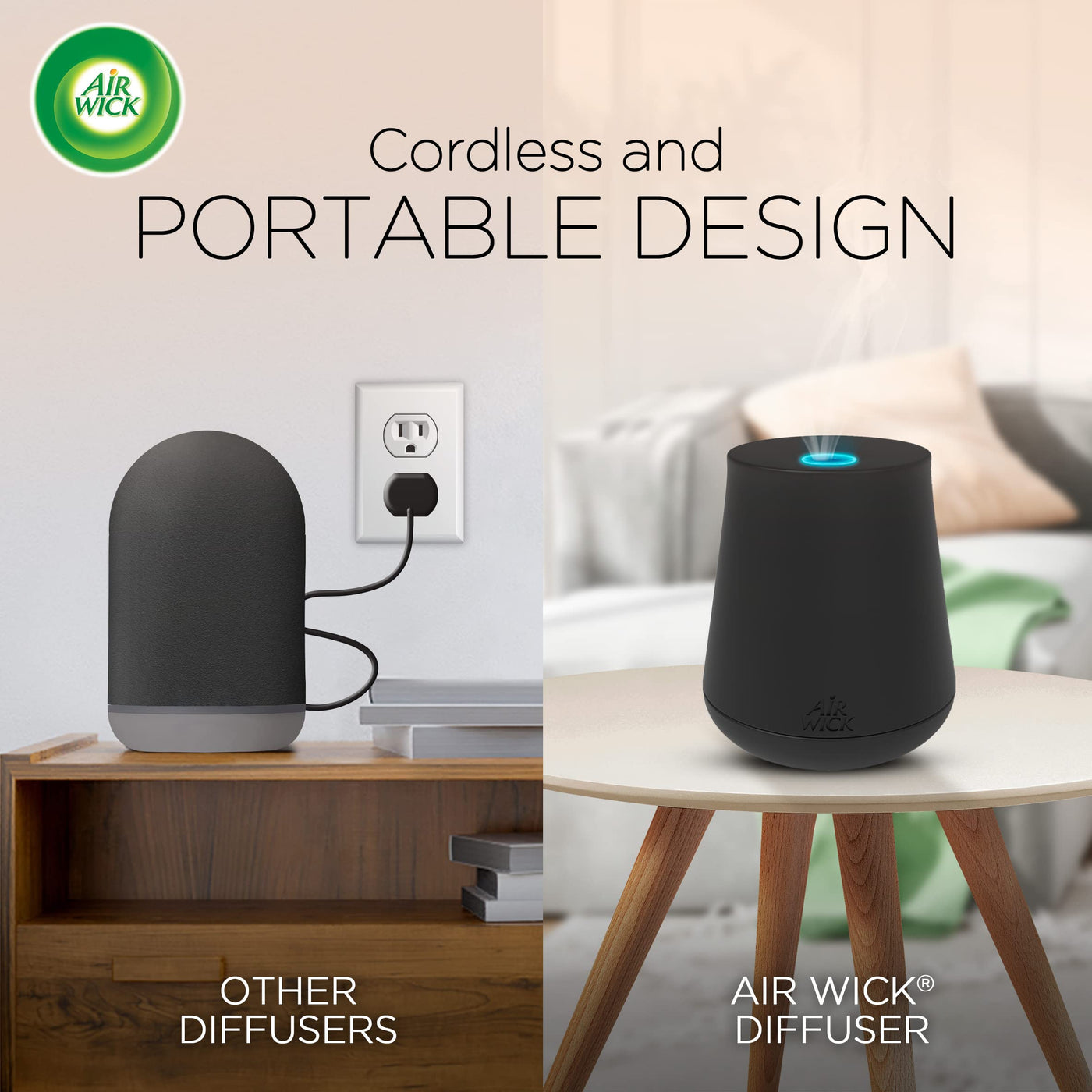 Q: Is the Air Wick Essential Mist diffuser portable?A: Yes, the Air Wick Essential Mist diffuser features a cordless design, allowing you to easily move it from room to room without needing to be near an outlet.