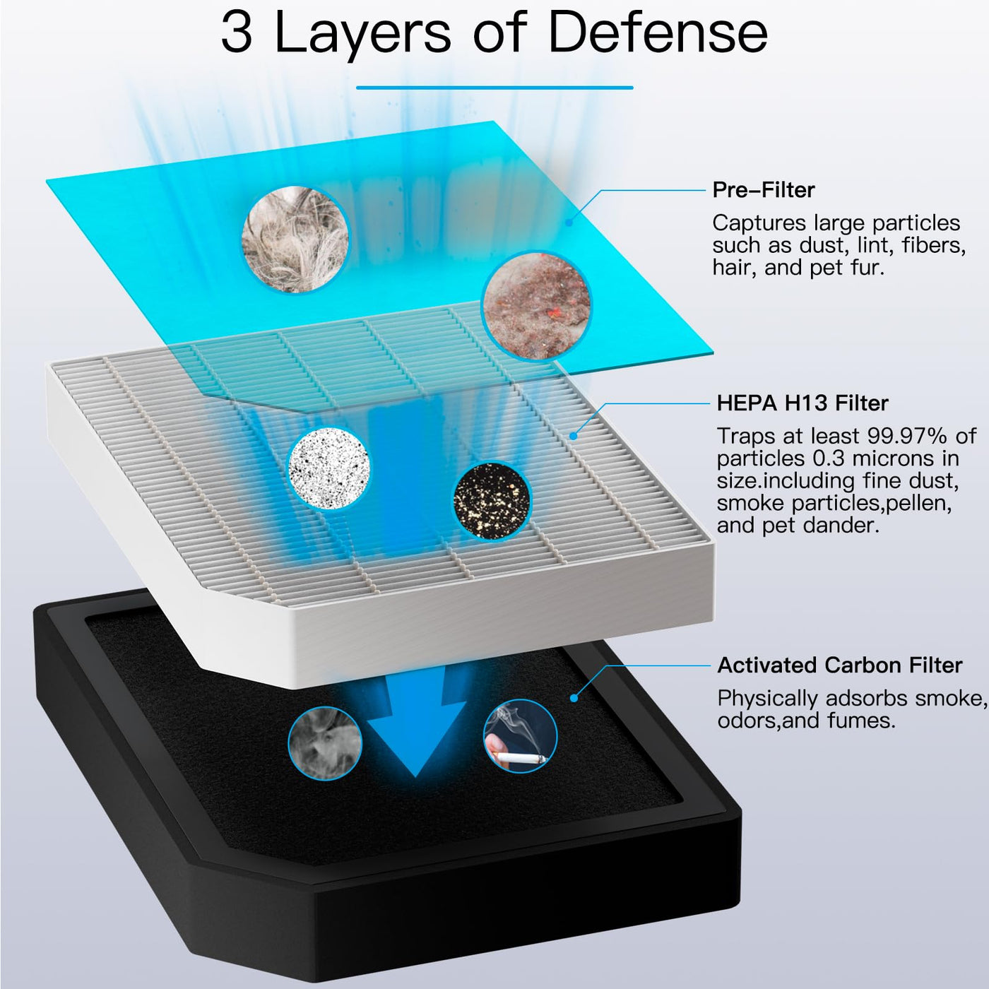 Q: What type of filter is included in the Aircillin Air Purifier AP1501 Replacement Filters?A: The Aircillin Air Purifier AP1501 Replacement Filters include an H13 True HEPA Filter, a Pre-Filter, and an Activated Carbon Filter, which work together to capture 99.99% of particles as small as 0.1 microns.
