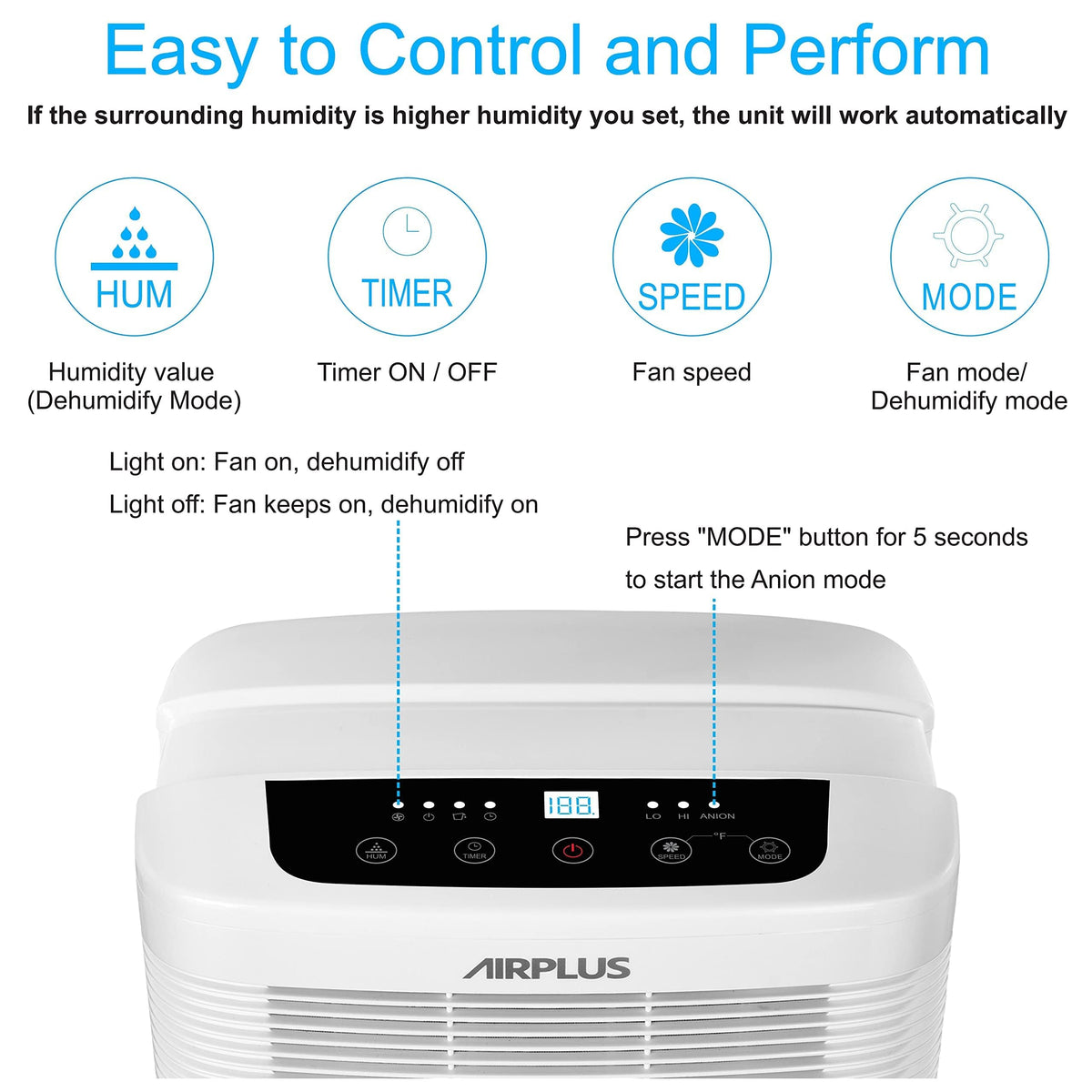 Q: What modes does the AIRPLUS Dehumidifier offer?A: The AIRPLUS Dehumidifier features four modes: Dehumidifier mode, Anion mode, fan mode, and a two-speed option (low and high), allowing you to customize the performance based on your needs.