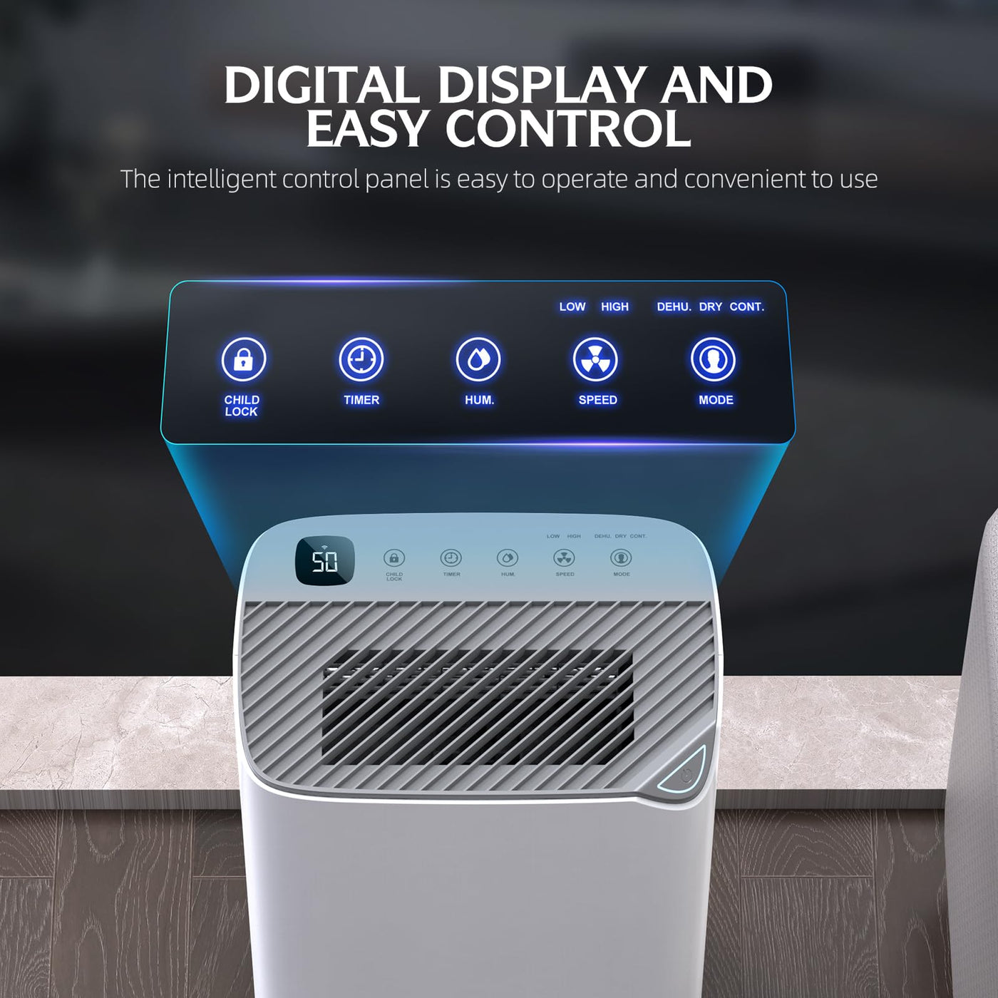 Q: How does the intelligent humidity control work?A: This dehumidifier allows you to adjust the humidity level between 30% and 80%, increasing or decreasing by 5% at a time, helping you maintain your desired comfort level efficiently.