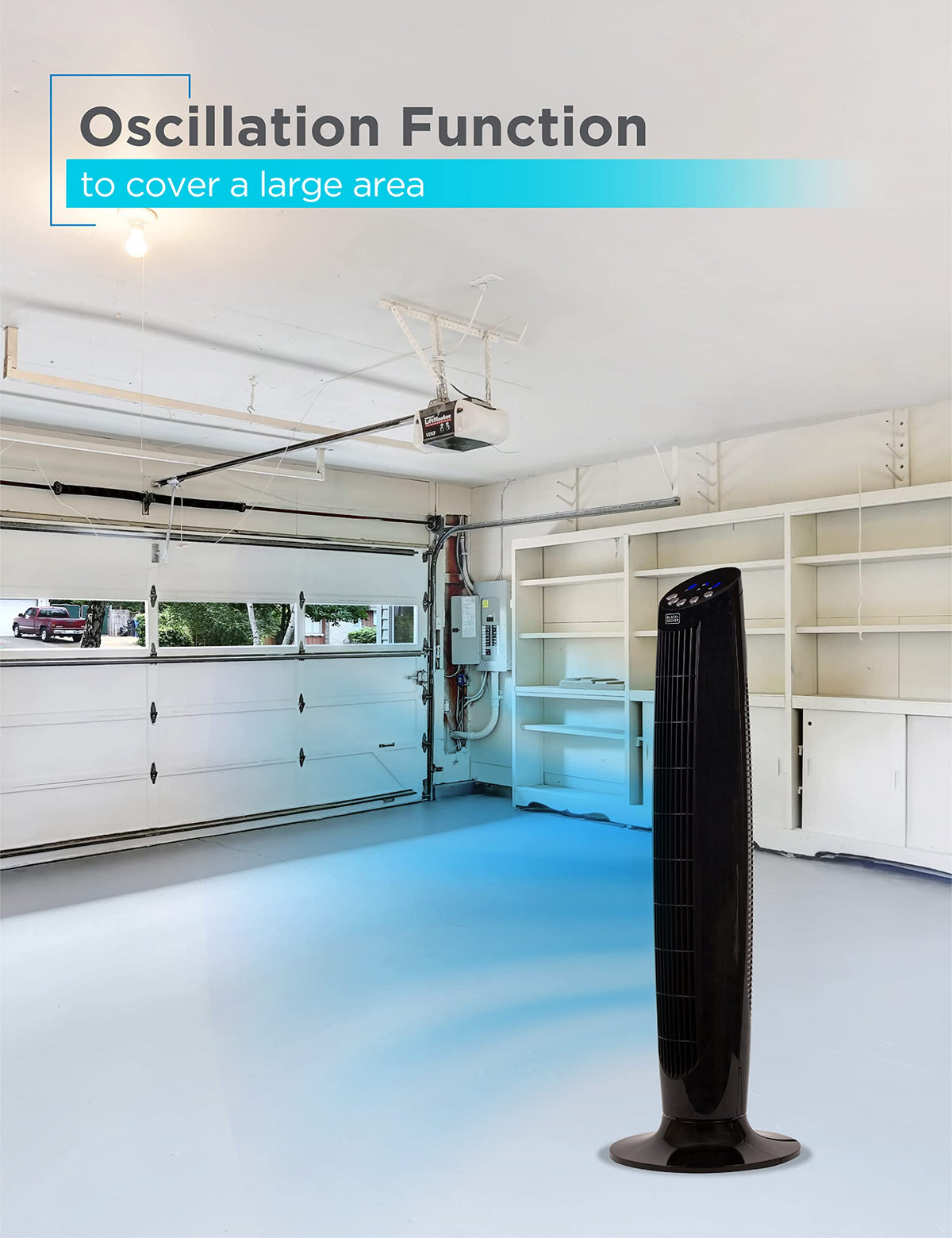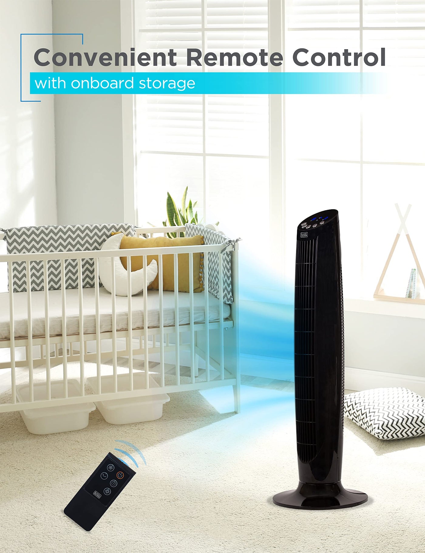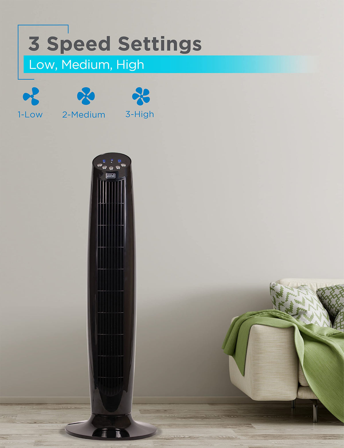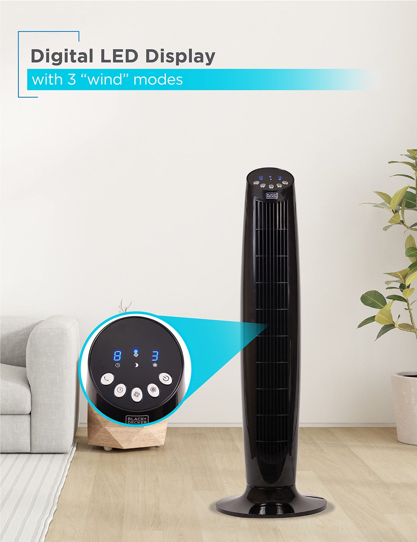 This Bftr36B Black+Decker 36 In. Digital Tower Fan With Remote Is The Ideal Addition Just About Anywhere In The House Where Increased Air Flow Is A Necessity. You Have 3 Speeds To Control Just How Much Air You Want To Push In A Direction Or Use The Oscillation Function To Expand The Scope Of The Circulation Area. There Are Even 3 Wind Modes! With The Timer, You Don'T Even Need To Be Around To Start And Stop Your Black Unit. Operating From The Controls On The Unit Itself Or The 'Couch Potato' Remote Control, You'Ll Have That Much Needed Relief In Seconds.