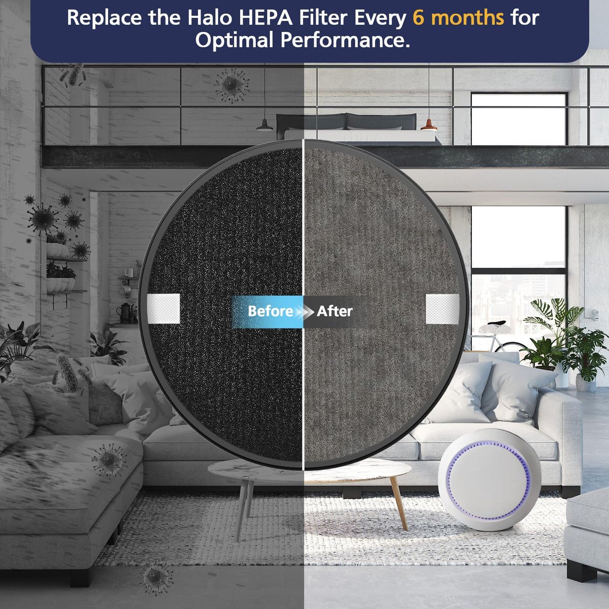 Q: How often should I replace the Cabiclean Halo HEPA filter?A: For optimal performance, it is recommended to replace the Cabiclean Halo HEPA filter every 6 months. However, this may vary depending on usage and the environment. Regular replacement ensures efficient air purification.